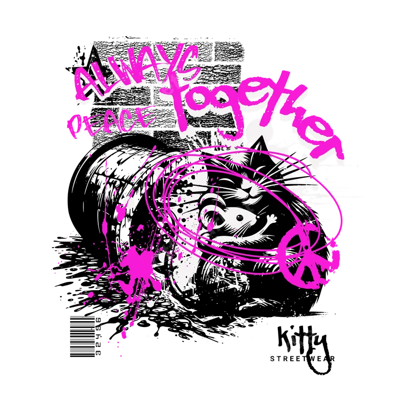 See allThis vibrant DTF transfer blends urban cool with a peaceful sentiment, featuring a stylized cat embracing a mouse amidst dynamic black ink and neon pink paint splatters. With a distressed brick wall and "ALWAYS PEACE TOGETHER" text, the design embodies a distinct streetwear and graffiti art aesthetic. It’s an edgy statement piece for expressing a harmonious yet rebellious vibe. This design is completely ready to press, making apparel customization effortless. This eye-catching heat press design is ideal for street art fans, cat lovers, and anyone appreciating a unique, counter-culture look. Perfect for personalizing casual wear, creating statement pieces for music festivals, art events, or adding urban flair to everyday wardrobes. This ready to press transfer makes a fantastic gift for friends or family into punk, hip-hop, or grunge fashion, ensuring they stand out. Imagine this edgy shirt design on your favorite tee or hoodie! Applying this high-quality iron on transfer is straightforward. It works seamlessly on cotton, polyester, and various blends, ensuring wide versatility. For best results, use a heat press at 300-325°F for 15 seconds with medium pressure, then peel cold. If using a household iron, apply firm, even pressure. No tedious weeding is required, so you achieve professional results quickly and easily. Crafted using premium DTF film and vibrant, long-lasting inks, this apparel transfer promises exceptional durability and color retention. The design is engineered to be crack-resistant and soft to the touch, ensuring comfort and longevity wash after wash. Our professional direct to film transfer technology guarantees sharp details and rich colors that pop, allowing you to create custom garments that look and feel professionally made. This iron on decal is built to last!