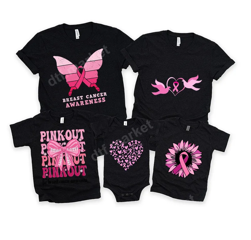 See allExpress unwavering support with our vibrant Breast Cancer Awareness DTF transfer designs. This ready to press collection features five iconic pink ribbon motifs: a graceful butterfly, doves with a ribbon heart, a bold 'PINK OUT' bow, a heart filled with ribbons, and a sunflower with a pink ribbon. Crafted in vivid pinks, each design symbolizes hope, strength, and solidarity in the fight against breast cancer, perfect for creating custom, impactful apparel. These inspiring heat press designs are ideal for breast cancer survivors, their families, and friends, or anyone advocating during Breast Cancer Awareness Month in October. Perfect for charity walks, fundraising events, support group gatherings, or as thoughtful gifts to spread awareness. Create matching team shirts for your support squad or personalize items for a loved one. Each iron on transfer serves as a powerful visual reminder of early detection and ongoing research. Applying your new breast cancer awareness apparel transfer is simple and efficient. Our heat press transfers work seamlessly on a wide range of fabric types, including cotton, polyester, and various blends. For best results, use a heat press at 300-325°F for 15 seconds with medium pressure. These ready to press transfers can also be applied with a high-quality household iron for smaller projects. Enjoy the convenience of no weeding or masking required – just press and peel for a flawless finish. Experience superior quality with our professional-grade DTF transfers. Each direct to film transfer offers incredibly vibrant colors and excellent wash fastness. Our durable film is crack-resistant and maintains a super soft feel, even after multiple washes. The strong adhesive ensures a lasting bond, making your custom t-shirt transfer a cherished item for years. Stand with strength and hope with dtf.market's premium designs.