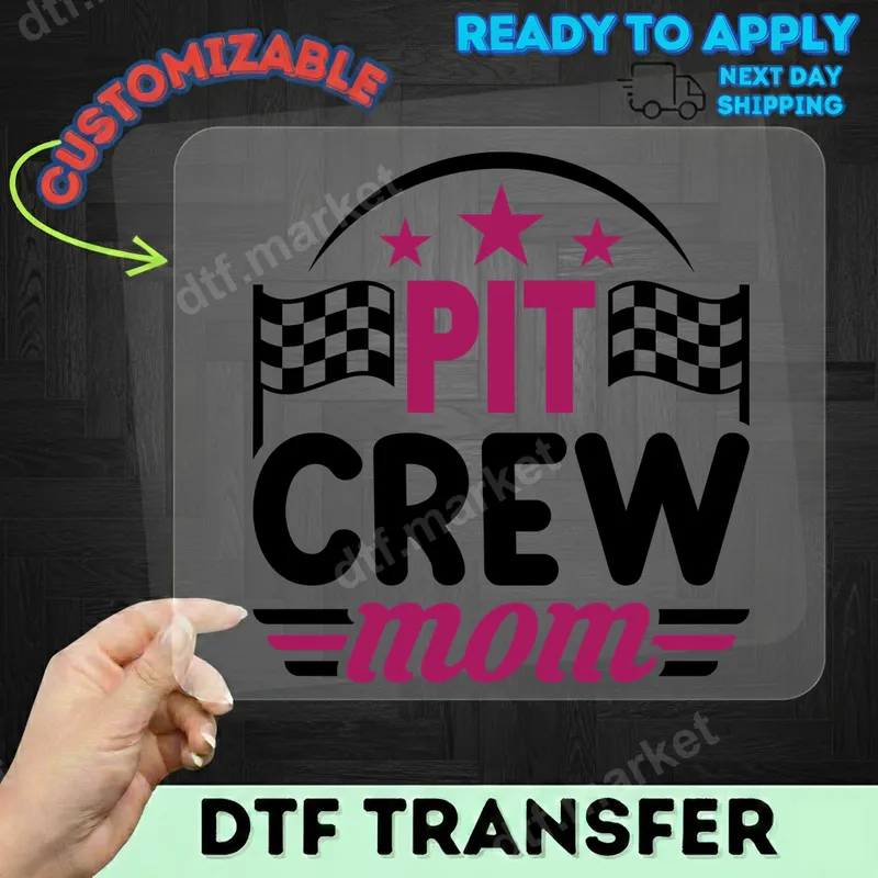 See allThis vibrant "Pit Crew Mom" DTF transfer features bold black and pink lettering, flanked by classic checkered racing flags and celebratory stars. It’s the ultimate statement piece for any dedicated racing mom, ready to press onto your favorite apparel. This direct to film transfer is professionally printed and designed to make your passion for motorsports shine. Perfect for moms who spend their weekends at the track supporting their favorite racer, this iron on transfer is ideal for race day events, team gatherings, or casual wear. It makes a thoughtful gift for Mother's Day, birthdays, or just to celebrate the incredible dedication of a racing mom. Show your pride and camaraderie with this unique heat press design. Applying this high-quality heat transfer is a breeze! It works beautifully on a wide range of materials, including cotton, polyester, and various blends. Simply use a heat press at 300-325°F for 15 seconds with medium pressure. For those without a professional heat press, a household iron can also be used with careful application. Best of all, there's absolutely no weeding required, making custom apparel creation quick and easy. Our ready to press transfers are crafted using premium DTF film and inks, ensuring exceptional vibrancy and durability. You'll love the soft feel of the design, which resists cracking and peeling, even after multiple washes. Create professional-looking t-shirt transfers and custom apparel that lasts, celebrating your role as the best pit crew mom.
