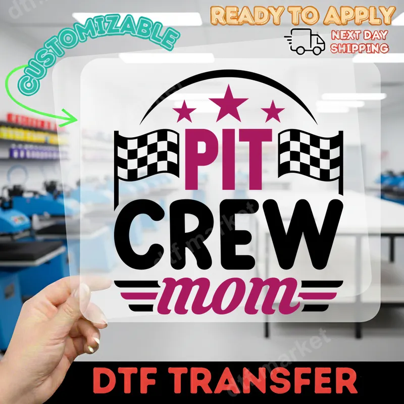 See allThis vibrant "Pit Crew Mom" DTF transfer is perfect for any dedicated racing mom! Featuring bold magenta text, classic racing flags, and stars, it captures the excitement and passion of race day. It’s a ready to press design that brings speed and style to your apparel with ease, ensuring you stand out in the stands or pit. This unique heat transfer is ideal for moms who spend their weekends at the track, supporting their racers in motorsports like NASCAR, drag racing, dirt track events, or go-karting. It makes a fantastic gift for Mother's Day, birthdays, or just to celebrate her dedication as a proud pit crew mom. Show your team spirit at any race, rally, or sporting event with this eye-catching graphic. Applying this iron on transfer is straightforward. It works beautifully on a wide range of fabrics including cotton, polyester, and their blends. Simply use a heat press at 300-325°F for 15 seconds with medium pressure, or apply with a household iron. Best of all, there's no weeding required, making custom apparel creation quick and hassle-free. Crafted on professional-grade DTF film, this t-shirt transfer boasts exceptional durability. The colors are incredibly vibrant, resistant to cracking, and designed to maintain their integrity wash after wash. The finish is soft to the touch, ensuring your custom garment feels as good as it looks, providing a truly professional appearance every time.