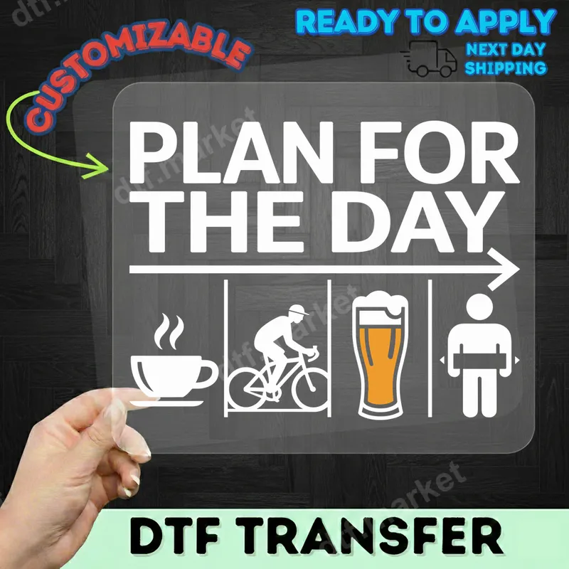 See allThis playful 'Plan For The Day' DTF transfer features a humorous daily routine: coffee, cycling, beer, and relaxation. It's the perfect ready to press design to show off your priorities in a fun, relatable way. Our high-quality direct to film transfer is vibrant and durable, making it an excellent choice for customizing your favorite apparel. This unique heat press transfer is designed for easy application, ensuring a professional look every time. Ideal for cyclists, coffee lovers, craft beer enthusiasts, or anyone who enjoys a balanced day of activity and relaxation. This iron on transfer makes a fantastic gift for birthdays, Father's Day, or just because. Perfect for casual wear, weekend outings, cycling events, or even as a humorous addition to your home brewing club gear. It’s also great for groups looking for matching shirt designs for a fun event or trip. Applying this ready to press transfer is simple and efficient. It works seamlessly on a wide range of fabrics including 100% cotton, polyester, and various cotton/poly blends. For best results, use a heat press at 300-325°F for 15 seconds with medium pressure. No specialized equipment? A household iron can also be used with firm, even pressure. Unlike traditional vinyl transfer designs, there's absolutely no weeding required, saving you time and effort. Experience superior quality with our professional-grade DTF transfers. Each design boasts vibrant colors that pop, exceptional wash durability, and remarkable crack resistance. The soft-touch finish ensures comfort, feeling lightweight and integrated with your garment, not heavy or stiff. Crafted with premium DTF film and strong adhesive, this apparel transfer will look fantastic and last through countless wears and washes, maintaining its crisp appearance.