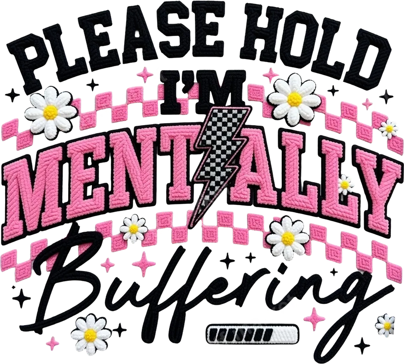 See allDive into the mood with this vibrant "PLEASE HOLD I'M MENTALLY Buffering" DTF transfer. Featuring bold, chunky lettering reminiscent of a retro chenille patch, this ready to press design combines striking black and bright pink text with playful elements like a checkerboard lightning bolt, sweet white daisies, and a classic buffering bar graphic. Its unique Y2K aesthetic and sarcastic humor make it a standout apparel transfer for anyone feeling a little overwhelmed by life's demands. This expressive heat transfer is perfect for Gen Z, millennials, students, or anyone who appreciates a good dose of relatable, sassy humor. It makes an excellent gift for friends, a fun statement piece for casual outings, or a conversation starter for social gatherings. Embrace your inner busy-brain with a design that's both stylish and utterly relatable, perfect for adding personality to your everyday wardrobe. Applying this high-quality iron on transfer is a breeze, whether you're a seasoned crafter or a beginner. It adheres beautifully to a wide range of fabrics, including cotton, polyester, and their blends. For best results, use a heat press at 300-325°F for 15 seconds with medium pressure, followed by a cool peel. A household iron can also be used with care. The best part? No tedious weeding required, making your customization process quick and effortless. Crafted with professional-grade DTF film, this heat press transfer promises exceptional durability and a vibrant, long-lasting finish. Enjoy colors that pop and resist cracking, all while maintaining a soft, flexible feel on your garment. Our direct to film transfers feature strong adhesive for a secure bond, ensuring your customized apparel will look fantastic wash after wash.