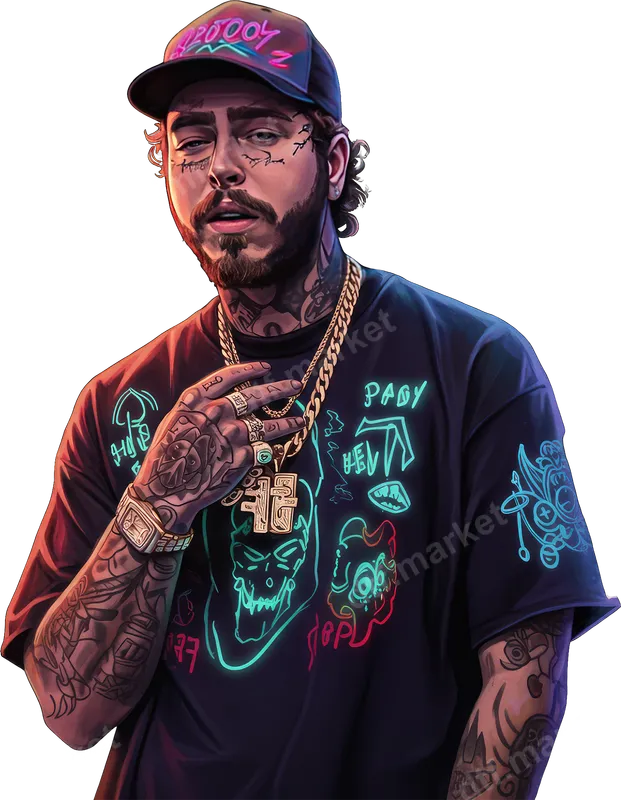 See allCapture the electrifying energy of Post Malone with this vibrant DTF transfer. This stylized portrait showcases the iconic artist with his signature facial tattoos, gold chains, and a 'Stoney' cap. Neon blue and pink accents highlight the edgy, street-art inspired aesthetic, making this a truly unique and eye-catching design. This high-quality ready to press transfer lets you easily bring a music legend to your favorite garments. This Post Malone heat press design is perfect for devoted fans of hip-hop, rap, and pop music. Ideal for personalizing apparel for concerts, music festivals, or just showcasing your unique style. It makes an unforgettable birthday or holiday gift for any music enthusiast. Add a touch of celebrity flair to your everyday look or create custom merchandise easily with this iron on transfer. Our premium apparel transfer works seamlessly on 100% cotton, polyester, and various blends. For best results, use a heat press at 300-325°F for 15 seconds with medium pressure, then cold peel. A household iron can also be used with careful application. Enjoy the convenience of a ready-to-use design with no weeding or layering required, making customization quick and effortless. Experience superior quality with our professionally printed direct to film transfers. Our designs offer exceptional durability, vibrant colors, and remain crisp wash after wash. The finished graphic is soft to the touch, ensuring comfort, and is highly resistant to cracking or peeling. Elevate your custom creations with a professional-grade heat transfer that truly stands out and lasts.