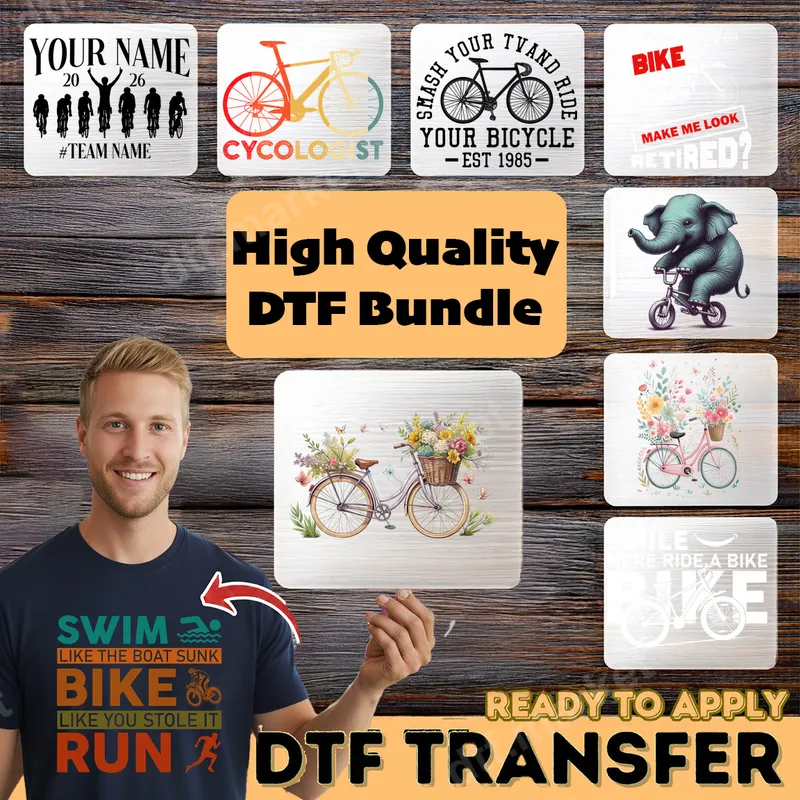 See allDiscover the ultimate collection for bike enthusiasts with our Premium Cycling DTF Transfer Bundle. This versatile pack features a range of ready to press designs, from vintage cycling graphics and humorous biker quotes to charming floral bicycles and custom team cycling options. Each high-quality DTF transfer is designed to bring your passion for two wheels to life, offering a diverse selection for every type of rider. Perfect for avid cyclists, weekend riders, triathletes, or anyone who loves the open road, these heat press transfers make fantastic gifts for birthdays, Father's Day, or cycling events. Whether customizing apparel for your bike club, creating unique outfits for a group ride, or simply expressing your love for cycling, this collection has a design for every occasion. Applying these iron on transfers is incredibly easy, perfect for both professional crafters and DIY enthusiasts. Our DTF transfers work beautifully on a wide variety of materials, including cotton, polyester, and cotton-poly blends. Simply use a heat press at 300-325°F for 15 seconds with medium pressure, or follow instructions for a household iron. No weeding or complex layering required – just press and peel for a flawless finish. Experience superior quality with our professionally printed DTF transfers. Each image boasts vibrant colors, crisp details, and exceptional durability, ensuring your designs will not crack, peel, or fade. The advanced DTF film provides a soft-hand feel that integrates seamlessly with your fabric, offering a comfortable and long-lasting garment. Elevate your apparel with these top-tier, ready-to-press heat transfers.