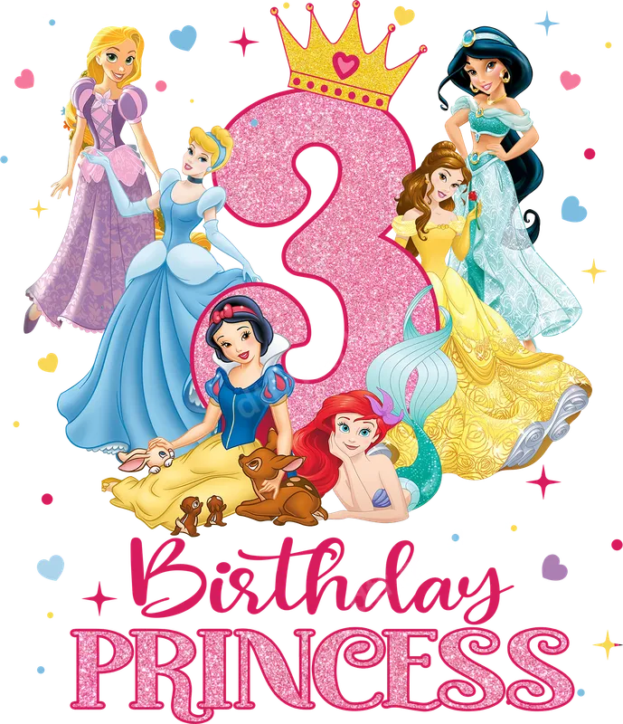 See allBring fairytale magic to her special day with this enchanting 3rd Birthday Princess DTF transfer. This vibrant design showcases beloved classic princesses, including Cinderella, Snow White, Ariel, Belle, Jasmine, and Rapunzel, surrounding a dazzling glitter pink number '3' topped with a golden crown. Below, the festive 'Birthday Princess' text in coordinating glitter and script fonts adds a celebratory touch. This ready to press transfer is perfect for creating memorable birthday apparel. This charming heat transfer is ideal for parents, grandparents, or anyone looking to create a personalized gift for a little girl turning three. It's the perfect iron on design for birthday party outfits, family matching shirts for the celebration, or unique photo shoot props. Make her feel like royalty on her big day with a custom piece of clothing she'll adore and cherish, commemorating this special milestone. Our premium heat press transfer is designed for easy application on a wide range of materials, including cotton, polyester, and most fabric blends. For best results, apply with a heat press at 300-325°F for 15 seconds with medium pressure, then cold peel the film. No professional equipment? A household iron can also be used with care. Enjoy hassle-free crafting with this pre-printed apparel transfer that requires absolutely no weeding or layering. Experience superior quality with our durable direct to film transfers. Each t-shirt transfer boasts incredibly vibrant colors and sharp details that won't crack, fade, or peel when properly applied and cared for. The transfer is soft to the touch, ensuring comfort for the wearer. Made with professional-grade DTF film and a strong adhesive, your customized garments will withstand countless washes and adventures, looking fantastic every time.