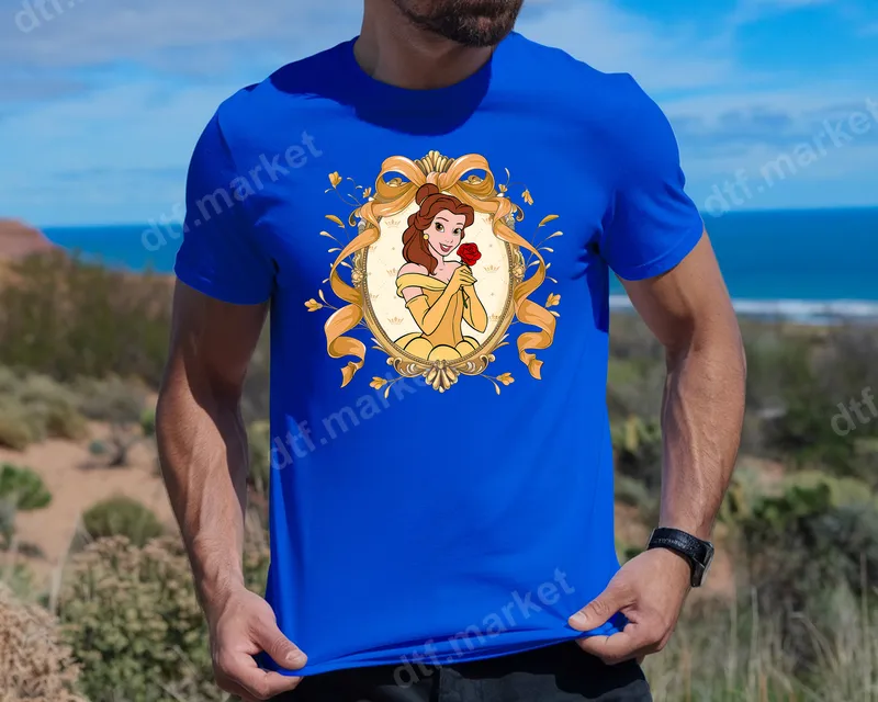 See allStep into a world of enchantment with our captivating Princess Belle DTF transfer. This beautifully detailed design showcases Belle, the beloved protagonist from Beauty and the Beast, in her iconic yellow ball gown. She tenderly holds a single red rose, elegantly framed by an ornate gold oval adorned with flowing ribbons and delicate floral accents. This premium direct to film transfer arrives ready to press, allowing you to easily add a touch of classic fairy tale charm to any garment or accessory. This charming Belle design is perfect for Disney fans of all ages, fairy tale enthusiasts, and anyone who cherishes classic animated stories. It makes an ideal gift for birthdays, Mother's Day, Valentine's Day, or just because you want to surprise a loved one with a personalized item. Create unique custom t-shirts for theme park trips, special events, or everyday wear. Imagine this elegant heat transfer on a tote bag for a book lover or a sweatshirt for a child's favorite princess. Applying this ready to press transfer is simple and efficient. Our high-quality iron on transfer works seamlessly on a wide variety of materials, including 100% cotton, 100% polyester, and cotton/poly blends. For best results, use a heat press at 300-325°F for 15 seconds with medium, even pressure. This design requires no weeding, saving you time and effort. While a heat press is recommended for professional results, a household iron can also be used with careful application. Experience the superior quality of our DTF transfers. Each design boasts vibrant colors that pop, ensuring your finished product looks stunning and eye-catching. Our prints are designed to be crack-resistant, offering long-lasting durability through countless washes. The transfer process results in a soft-to-the-touch finish that feels comfortable on any garment. We use professional-grade DTF film with a strong adhesive, guaranteeing a smooth and reliable application every time.