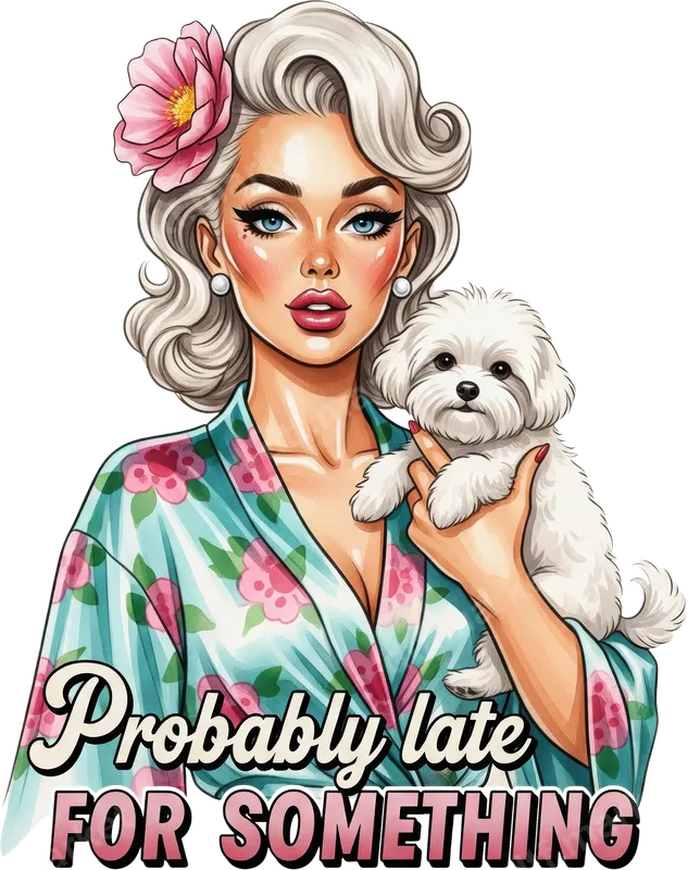 See allShow off your glamorous, yet always-on-the-go personality with our "Probably Late For Something" DTF transfer. This vibrant design features a stunning vintage-style pin-up girl with elegant blonde curls, a charming pink flower, and a fluffy white dog, all wrapped in a sassy, floral robe. This high-quality DTF transfer is ready to press, making it easy to add a touch of retro humor and sparkle to any garment. This delightful direct to film transfer is perfect for anyone with a playful sense of humor, dog lovers, or those who appreciate vintage aesthetics. It's an ideal gift for a friend who's perpetually running behind, a treat for yourself, or a unique addition to your custom apparel collection. Great for birthdays, casual outings, or just adding a personal touch to your everyday wardrobe, this heat press design is sure to turn heads and bring smiles. Applying this heat transfer is incredibly simple. Our ready to press transfers work beautifully on a wide range of fabrics, including cotton, polyester, and cotton/poly blends. Just grab your heat press (recommended at 300-325°F for 15 seconds with medium pressure) or even a household iron, and you’re ready to create custom shirts and accessories. Unlike traditional vinyl transfers, there’s no weeding involved, saving you time and effort. Experience the professional quality of our apparel transfers. Each iron on transfer boasts vibrant, true-to-color inks that are crack-resistant and soft to the touch, ensuring your design looks fantastic and lasts through countless washes. Our DTF transfers are printed on premium film with strong adhesive, providing excellent durability and a superior finish for all your t-shirt transfer projects.