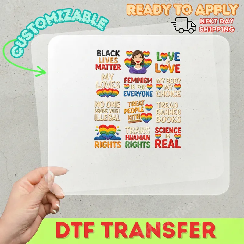 See allThis impactful DTF transfer showcases vital social justice messages: "Black Lives Matter," "Love is Love," "Feminism is for Everyone," "My Body My Choice," "No One is Illegal," "Treat People with Kith," "Tread Banned Books," "Trans Rights are Human Rights," and "Science is Real." Adorned with rainbow hearts, this ready to press design promotes unity, equality, and human rights. Perfect for activists, allies, and educators passionate about progressive causes. Personalize apparel for marches, rallies, community events, or daily wear to spread awareness. Create inspiring gifts for friends and family championing equality, or unique items for fundraisers and awareness campaigns, especially during Pride Month. This premium heat press transfer applies effortlessly to cotton, polyester, and blends. Use a heat press at 300-325°F for 15 seconds with medium pressure, then cold peel. A household iron can also be used. Unlike traditional vinyl transfers, no weeding is required, making your customization process quick and hassle-free. Our direct to film transfer offers superior quality with vibrant, crack-resistant colors that resist fading, ensuring your message lasts. The professional-grade DTF film provides a soft, flexible feel that integrates seamlessly with your garment, offering excellent durability and a comfortable finish. This t-shirt transfer delivers professional results every time.