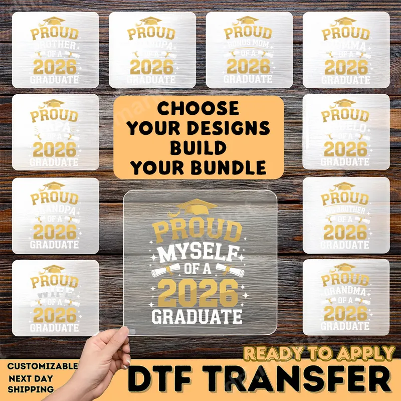 See allCelebrate the monumental achievement of your 2026 graduate with this exclusive "Proud [Family Member] of a 2026 Graduate" DTF transfer collection. Featuring classic graduation caps, elegant diplomas, and shimmering stars, each design is meticulously crafted to convey pride and joy. These ready to press transfers boast a stylish distressed texture in rich gold and crisp white, making them perfect for any garment color and an instant celebration statement. This versatile heat press transfer is ideal for parents, grandparents, siblings, aunts, uncles, or even the graduate themselves. It’s perfect for creating custom apparel for graduation ceremonies, senior year celebrations, graduation parties, or as a thoughtful gift. Show your support and collective pride in the Class of 2026 with a unique shirt design that stands out. Applying your new apparel transfer is effortless. Our high-quality DTF transfers can be easily applied with a heat press at 300-325°F for 15 seconds with medium pressure, or even a household iron. Forget the hassle of weeding vinyl; these iron on transfers require no complex preparation, ensuring a smooth and quick application process onto cotton, polyester, or blend fabrics. Experience superior quality with every DTF transfer. Our designs are printed on professional-grade film, ensuring vibrant colors that pop, excellent durability, and resistance to cracking or fading after multiple washes. The soft-touch finish integrates seamlessly with your fabric, creating a professional-looking shirt that feels great and lasts for years, cherishing that special 2026 memory.