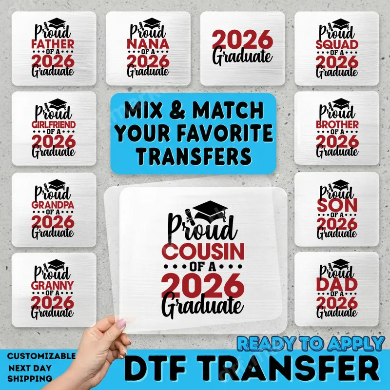 See allShow your immense pride for the Class of 2026 with our exclusive 'Proud [Relationship] of a 2026 Graduate' DTF transfer collection. These vibrant designs feature a classic graduation cap and diploma, paired with bold text declaring your special connection to the graduating senior. Each direct to film transfer is meticulously crafted to ensure a striking visual on any garment, making it easy to create custom apparel. You'll find options for parents, grandparents, siblings, friends, and more, all ready to press onto your chosen item. This collection is perfect for anyone celebrating a high school or college graduate in 2026. Whether you're a proud mom, dad, nana, grandpa, brother, sister, cousin, or best friend, these heat press designs let you wear your support visibly. Ideal for graduation ceremonies, senior parties, family gatherings, or as a thoughtful gift for the entire proud family. Create matching shirts for the whole squad to cheer on their graduate, making unforgettable memories of this milestone achievement. Applying these versatile t-shirt transfers is straightforward and requires no weeding, unlike traditional vinyl. Our heat press ready transfers work beautifully on a wide range of materials, including 100% cotton, polyester, cotton/poly blends, and even triblends. For optimal results, use a heat press at 300-325°F for 15 seconds with medium pressure, then cold peel the film. For those without a heat press, a household iron can also be used, making it accessible for everyone to create custom apparel. Experience superior quality with our premium DTF transfers. Each iron on transfer boasts incredibly vibrant colors that stand out, and the durable prints are designed to be crack-resistant and soft to the touch, ensuring comfort and longevity. We use professional-grade DTF film with a strong, reliable adhesive that binds securely to your fabric, enduring countless washes without fading or peeling. Elevate your celebration with a high-quality shirt design that truly lasts.