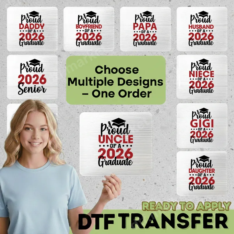 See allThis collection of DTF transfers proudly announces the Class of 2026. Each design features a stylish blend of script and bold typography, including "Proud Daddy," "Proud Papa," "Proud Niece," "Proud Uncle," "Proud Gigi," "Proud Husband," "Proud Boyfriend," and "Proud 2026 Senior." The designs are ready to press, making it simple to create personalized apparel for graduation celebrations. These vibrant, high-quality heat press designs capture the excitement and pride surrounding this significant milestone. These versatile heat press transfers are perfect for anyone celebrating a 2026 graduate. Ideal for parents, grandparents, aunts, uncles, siblings, and partners who want to show their support at graduation ceremonies, parties, and family gatherings. Create unforgettable gifts for your graduate by customizing a shirt, tote bag, or hat. They're also fantastic for seniors themselves who want to declare their graduation year with pride. Applying these direct to film transfers is incredibly easy, requiring no weeding or intricate cutting. They adhere beautifully to a wide range of fabric types, including cotton, polyester, and various blends. For best results, use a heat press at 300-325°F for 15 seconds with medium pressure, then peel cold. You can even apply these iron on transfers using a household iron, following specific instructions for a flawless finish. Our premium quality DTF transfers ensure your custom apparel will stand out. Printed on professional-grade direct to film sheets, these designs are known for their vibrant colors, excellent wash durability, and resistance to cracking or peeling. The strong adhesive provides a soft hand feel that seamlessly integrates with the fabric, creating a professional and lasting look that will be cherished for years to come. These t-shirt transfers are truly top-tier.