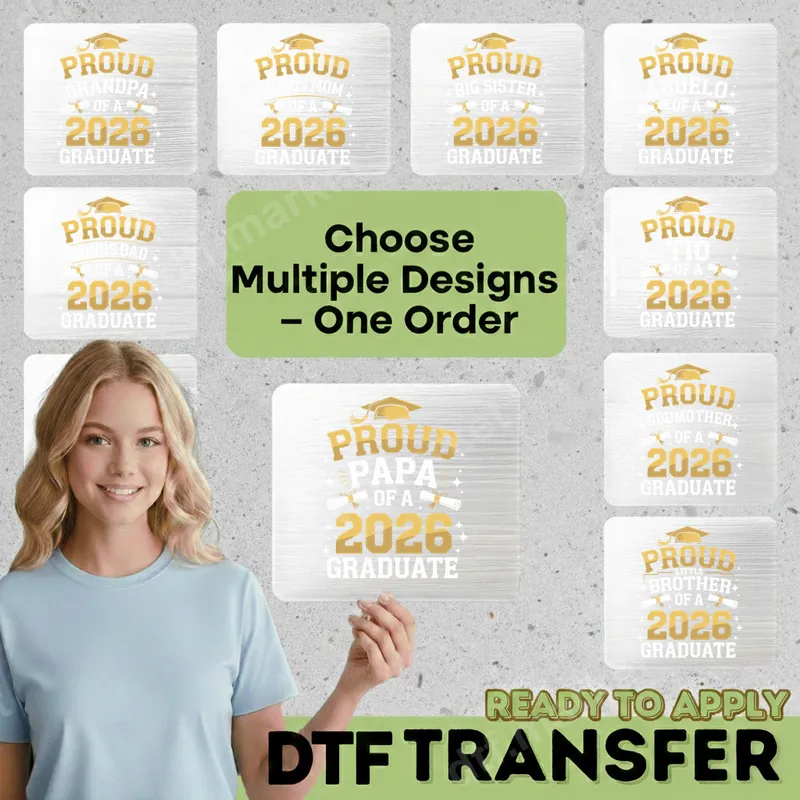 See allGet ready to celebrate the Class of 2026 with our "Proud Family of a 2026 Graduate" DTF transfer collection! Each design features bold gold and white typography, adorned with a classic graduation cap and diploma, conveying immense pride. These high-quality direct to film transfers are ready to press, allowing you to easily customize apparel for yourself and your loved ones to honor this special milestone. This exclusive collection is perfect for any proud family member celebrating a 2026 graduate. Whether you're a proud Grandpa, Bonus Mom, Big Sister, Abuelo, Bonus Dad, Godmother, Papa, or Little Brother, we have a design for you. These heat press designs make ideal gifts for graduation parties, senior year events, or for wearing on the big graduation day. Show your support and love for your graduate in style! Our ready to press transfers are incredibly versatile and easy to apply. They work flawlessly on a wide range of materials, including cotton, polyester, and various fabric blends. For best results, use a heat press at 300-325°F for 15 seconds with medium pressure, then perform a cool peel. You can also achieve great results with a household iron, following simple instructions. Best of all, there's no weeding required, making customization a breeze. Experience professional-grade quality with every iron on transfer. Our designs boast vibrant colors, are crack-resistant, and feel soft to the touch once applied to your garment. Made with durable DTF film and strong adhesive, these apparel transfers are designed to withstand countless washes and wear, ensuring your celebratory message stays bright for years to come.