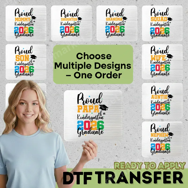 See allShow your immense pride with our vibrant "Proud [Family Role] of a Kindergarten 2026 Graduate" DTF transfer design. This ready to press design features a playful, multi-colored "2026" alongside a classic graduation cap, making it perfect for celebrating this significant milestone. Choose from various family roles like Mommy, Daddy, Grandma, Papa, Auntie, Uncle, Daughter, Son, Wife, and even "Squad" to match every proud supporter. These heat press transfers are ideal for anyone celebrating a kindergarten graduate in 2026. Whether you're a proud parent, doting grandparent, supportive aunt or uncle, or part of the graduate's special "squad," these designs are perfect for graduation ceremonies, end-of-year parties, family gatherings, or making memorable photo opportunities. They also make fantastic personalized gifts for the entire family. Applying your new apparel transfer is simple and requires no weeding. Our high-quality DTF transfers are designed to adhere beautifully to a wide range of materials, including cotton, polyester, and cotton/poly blends. For best results, use a heat press at 300-325°F for 15 seconds with medium pressure, or apply with a household iron following our detailed instructions. Experience professional quality with our durable, vibrant, and crack-resistant DTF film. Each iron on transfer is crafted to provide a soft-to-touch finish that blends seamlessly with your garment, ensuring your celebratory wear looks great and lasts for years to come. These designs boast strong adhesive properties, guaranteeing a long-lasting, cherished keepsake of this special academic achievement.