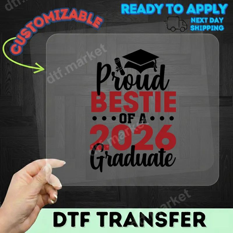 See allThe design features bold black and red lettering stating "Proud Bestie of a 2026 Graduate," accented with a classic graduation cap and diploma scroll. This vibrant DTF transfer is perfect for celebrating that special milestone with pride and style. It arrives ready to press, allowing you to quickly create custom apparel. This uplifting heat press design is ideal for friends, best friends, and anyone celebrating a loved one graduating in 2026. Perfect for graduation parties, ceremonies, senior events, or as a thoughtful gift to wear on the big day. It’s a fantastic way to show support for high school, college, or university graduates. Our premium direct to film transfer can be applied to a wide range of fabrics, including 100% cotton, polyester, and various blends, making it incredibly versatile. For best results, use a heat press at 300-325°F for 15 seconds with medium pressure. It can also be applied with a household iron. Enjoy a hassle-free application with no weeding required. Experience superior quality with our durable iron on decal. Each transfer boasts vibrant colors, excellent crack resistance, and a soft, flexible feel that seamlessly integrates with your garment. Crafted on professional-grade DTF film with a strong, long-lasting adhesive, these ready to press transfers ensure your personalized items look fantastic for years to come.