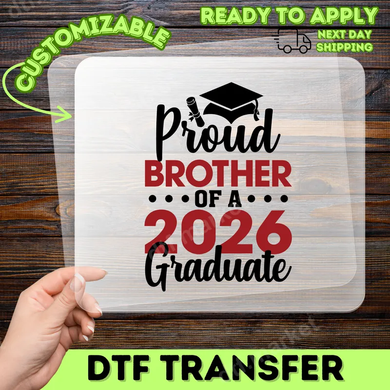 See allThis vibrant "Proud Brother Of A 2026 Graduate" DTF transfer features a stylish graduation cap and diploma with bold typography. The design blends script and block letters, creating a clear, celebratory statement. This ready to press design is perfect for showcasing family pride and excitement for an upcoming graduation milestone, offering a high-quality apparel transfer to honor your graduating sibling. This unique heat transfer is designed specifically for brothers wanting to proudly support their graduating sibling from the class of 2026. It’s ideal for wearing to graduation ceremonies, parties, family gatherings, or even everyday. This personalized heat press design makes an excellent gift, building anticipation and celebrating this significant achievement. Show your love and support with this meaningful statement. Our direct to film transfers adhere beautifully to fabrics like 100% cotton, polyester, and blends. Application is simple: use a heat press at 300-325°F for 15 seconds with medium pressure, then cool peel. For those without a heat press, a household iron works too, making professional garment creation accessible. Best of all, no weeding is involved, saving you time and effort. Experience superior quality with our premium DTF transfers. Each iron on transfer boasts vibrant colors and sharp details that remain crisp wash after wash. Manufactured using professional-grade DTF film and strong adhesive, these designs are engineered to be crack-resistant and soft to the touch, ensuring comfort and longevity. Your finished apparel will look fantastic and feel great, providing a durable, professional print.