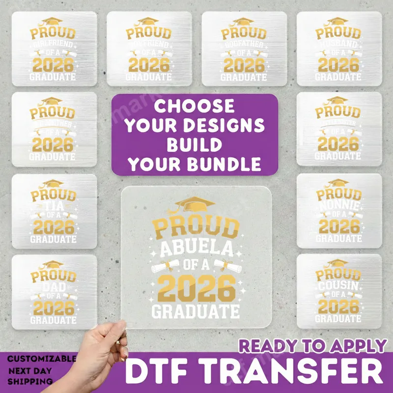 See allCelebrate the milestone achievement of your beloved 2026 graduate with this heartwarming DTF transfer. Featuring vibrant gold and white lettering, each design proudly declares "PROUD [RELATIONSHIP] OF A 2026 GRADUATE," adorned with a classic graduation cap and diploma scrolls. This premium direct to film transfer is designed for easy application, arriving as a ready to press piece that brings a celebratory spirit to any garment. This versatile heat press design is ideal for parents, grandparents, siblings, aunts, uncles, and close friends eager to show their support. With options for 'Proud Dad,' 'Proud Mom,' 'Proud Abuela,' 'Proud Tia,' 'Proud Brother,' and many more, you can customize apparel for every family member attending graduation ceremonies, parties, or senior year events. It's the perfect t-shirt transfer to create personalized gifts or matching family outfits. Applying this heat transfer is simple. Our transfers work seamlessly on a wide range of fabrics, including cotton, polyester, and their blends. For best results, use a heat press at 300-325°F for 15 seconds with medium, even pressure. While a heat press is recommended for professional results, this iron on transfer can also be applied with a household iron. Best of all, there's absolutely no weeding required, making your crafting process quick and enjoyable. Experience exceptional quality with our DTF transfers. Each transfer boasts vivid, long-lasting colors that resist cracking and peeling, ensuring your celebratory garment looks great wash after wash. The professional DTF film provides a soft-to-touch feel and features a strong adhesive for durable application. Show your pride with a beautiful, custom design that truly stands out.