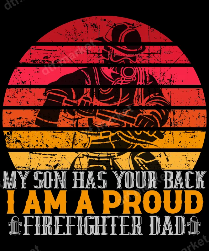 See allThis impactful DTF transfer showcases a powerful silhouette of a firefighter in full gear, set against a distressed retro sunset in vibrant reds, oranges, and yellows. The design proudly declares "MY SON HAS YOUR BACK I AM A PROUD FIREFIGHTER DAD," making it a perfect statement of pride and support. This high-quality, ready to press design brings a vintage yet bold aesthetic, ideal for honoring the brave individuals and their families who serve. This powerful heat press transfer is specifically designed for the proud fathers of firefighters, first responders, and anyone who wants to celebrate the heroism of their loved ones. It makes an exceptional gift for Father's Day, birthdays, Christmas, or any occasion to show appreciation for the sacrifices made. Perfect for showing unwavering support at community events, family gatherings, or simply as everyday wear. Our direct to film transfer is incredibly versatile, applying seamlessly to a wide range of fabrics including cotton, polyester, and various blends. Achieve a professional finish by using a heat press at 300-325°F for 15 seconds with medium pressure, or apply it easily with a household iron. Unlike traditional vinyl transfer methods, these heat press designs require absolutely no weeding, saving you time and effort. Experience the superior quality of our apparel transfer, crafted from professional-grade DTF film with strong adhesive properties for lasting durability. The colors are incredibly vibrant, crack-resistant, and remain soft to the touch even after multiple washes. This iron on decal ensures your custom garment will stand out, retaining its sharp details and message for years to come.