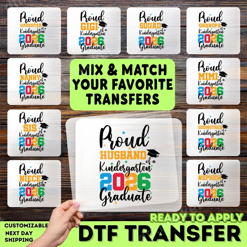 See allThis vibrant DTF transfer collection features 'Proud [Family Member] of a Kindergarten 2026 Graduate' designs, celebrating the milestone achievement of your little one. Each ready to press transfer showcases cheerful, colorful typography for the '2026' with a graduation cap accent, perfect for commemorating this special moment. Available for various family members, these direct to film transfers bring joy and pride to any garment. These heat transfer designs are ideal for parents, grandparents, siblings, and the entire family attending kindergarten graduation ceremonies in 2026. Create matching family shirts, use them as unique gifts for the graduate's support system, or craft memorable apparel for school events. These iron on transfers are a fantastic way to show collective pride and make the occasion even more special. Applying these heat press ready designs is simple and hassle-free. Our high-quality apparel transfers work beautifully on cotton, polyester, and blends. For best results, use a heat press at 300-325°F for 15 seconds with medium pressure, then warm peel. No specialized equipment is needed, and you'll love that there's absolutely no weeding required, making your crafting process quick and enjoyable. Experience the superior quality of our professional DTF transfers. Each shirt design is incredibly vibrant, ensuring colors pop and details shine. These transfers are designed for durability, offering excellent washability and crack-resistant wear. The soft-touch finish provides maximum comfort, making your custom apparel feel as good as it looks. Transform your favorite items into personalized keepsakes with our premium heat press designs.