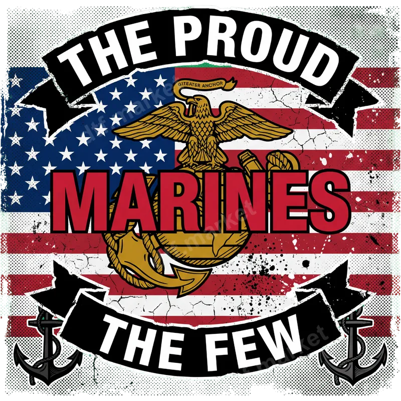 See allEmbrace unwavering patriotism and Marine Corps pride with this striking DTF transfer featuring a distressed American flag background. Dominating the center is the iconic USMC eagle, globe, and anchor emblem, flanked by bold text proclaiming "THE PROUD MARINES THE FEW." This grunge-style, ready to press design is perfect for creating impactful apparel that honors the dedication and sacrifice of the United States Marine Corps. This powerful heat transfer is ideal for Marine Corps veterans, active duty service members, military families, and patriotic Americans who wish to show their support. It makes an excellent gift for occasions like Veterans Day, Memorial Day, the Marine Corps Birthday, or simply as an everyday statement piece. Customize gifts for your favorite Marine or create matching apparel for family gatherings and patriotic events. Applying this iron on transfer is straightforward. It works beautifully on a wide variety of fabric types, including cotton, polyester, and their blends. Simply use a heat press at 300-325°F for 15 seconds with medium pressure. For those without a professional heat press, a household iron can also be used effectively. Best of all, there's no tedious weeding required, making customization quick and easy. Crafted with professional-grade DTF film, this apparel transfer ensures vibrant colors that pop and a soft, comfortable feel on any garment. The high-quality ink and strong adhesive provide exceptional durability, resisting cracking and peeling even after numerous washes. Showcase your respect and pride with a design that stands the test of time and proudly represents the USMC.