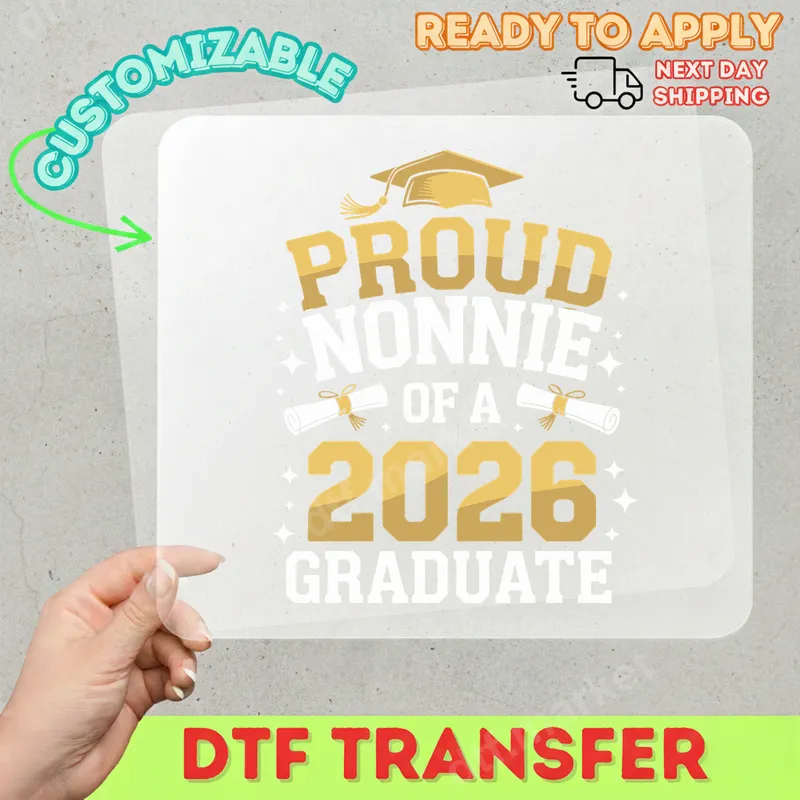 See allShow your immense pride with our 'Proud Nonnie Of A 2026 Graduate' DTF transfer. This vibrant design, featuring bold gold and white lettering accented with a graduation cap and diplomas, is the perfect way for any Nonnie to celebrate their beloved graduate. This high-quality DTF transfer is ready to press, making it easy to create custom apparel and gifts. This special heat transfer is designed for proud grandmothers, Nonnies, and family members of the Class of 2026. It's ideal for graduation parties, senior celebrations, family gatherings, or as a heartfelt gift. Imagine wearing this unique heat press design to the graduation ceremony or gifting it to the proud Nonnie in your life to commemorate this significant milestone. Applying your new apparel transfer is simple and efficient. Our transfers work beautifully on a wide range of materials, including cotton, polyester, and blends. For best results, use a heat press at 300-325°F for 15 seconds with medium pressure, then cold peel. You can also use a household iron, ensuring even pressure. There’s no weeding or intricate cutting required, making your crafting process smooth and enjoyable. Experience professional quality with every iron on transfer. Our DTF transfers boast vibrant colors, excellent wash durability, and a soft, flexible feel that won't crack or fade. Crafted using premium DTF film and strong adhesive, this ready to press transfer ensures your design looks fantastic and lasts for years, creating a cherished keepsake for the 2026 graduation season.