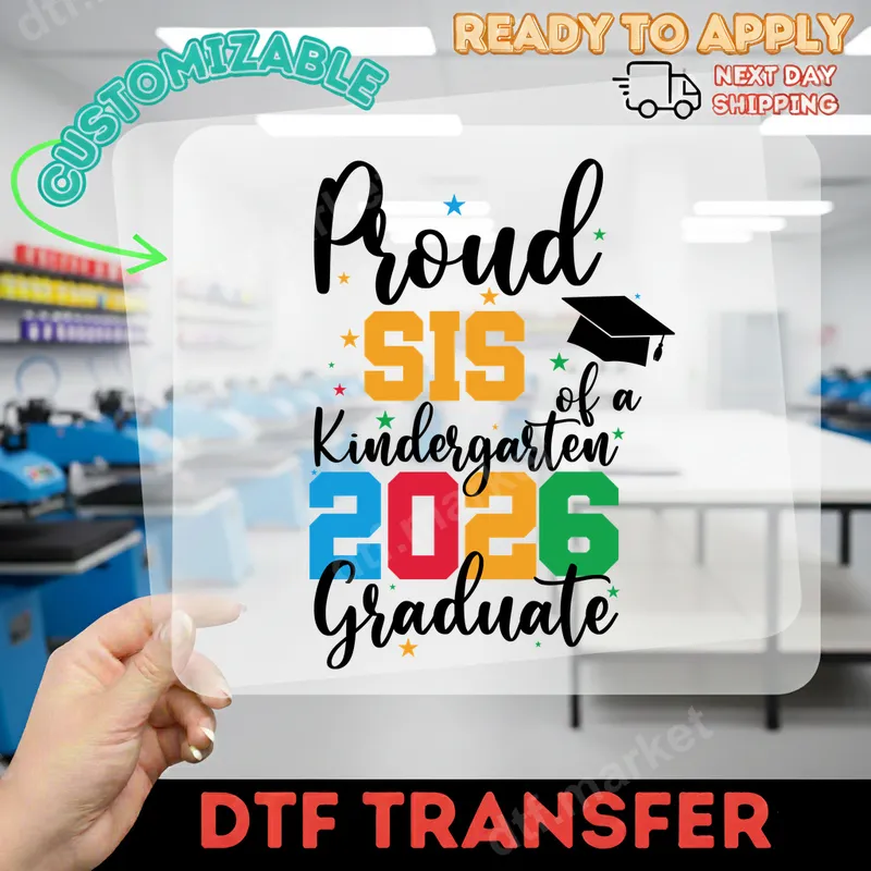 See allThis vibrant DTF transfer proudly declares "Proud SIS of a Kindergarten 2026 Graduate," making it the perfect way to show your support. Featuring a playful mix of script and bold colorful lettering, accented with a graduation cap and celebratory stars, this ready to press transfer brings joy and excitement to any garment. It's designed to be effortlessly applied, ensuring a professional look without the hassle. This inspiring heat press design is ideal for sisters who want to celebrate their younger sibling's significant milestone. Perfect for kindergarten graduation ceremonies, family parties, school events, or as a thoughtful gift for the proud sister in your life. It's a fantastic way to create matching family outfits or personalized gifts that commemorate this special achievement. Applying this durable t-shirt transfer is simple and straightforward. It works beautifully on a wide range of materials, including cotton, polyester, and various fabric blends. For best results, use a heat press at 300-325°F for 15 seconds with medium pressure. If using a household iron, ensure even heat and firm pressure for a similar duration. The best part? No weeding required, saving you time and effort! Crafted using premium DTF film and high-quality inks, this iron on transfer delivers exceptionally vibrant colors that stand out. Our transfers are designed to be crack-resistant, peel-resistant, and feel wonderfully soft to the touch once applied. Enjoy a professional-grade apparel transfer that ensures your commemorative design lasts for years to come, celebrating this special graduate with enduring style.