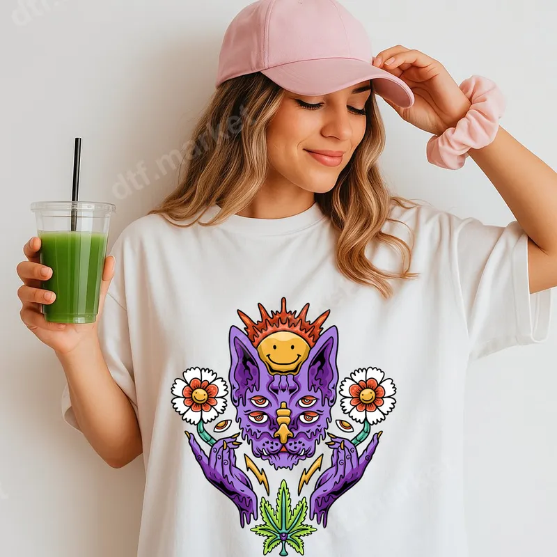 See allDive into a world of vibrant imagination with this unique psychedelic cat DTF transfer. This striking design features a multi-eyed purple feline, adorned with a smiling sun, vibrant flowers, and an unmistakable cannabis leaf at its base. It's a truly trippy and groovy heat press design, delivered as a ready to press transfer, perfect for adding an artistic, counter-culture touch to any garment. This eye-catching design is ideal for psychedelic art enthusiasts, cannabis culture followers, and anyone who loves unique, alternative fashion. It makes a fantastic statement piece for music festivals, casual outings, or just expressing your individual style. Surprise a friend with this cool t-shirt transfer for their birthday, or create custom apparel for a 4/20 celebration or a fun group event. Applying this versatile apparel transfer is a breeze. Our high-quality DTF transfers adhere beautifully to a wide range of materials, including cotton, polyester, and their blends. For best results, use a heat press at 300-325°F for 15 seconds with medium pressure, then perform a warm peel. No heat press? No problem! It can also be applied with a household iron, making it an accessible iron on transfer for everyone. Plus, there's absolutely no weeding required, saving you time and effort. Experience professional-grade quality with every DTF transfer. Our designs boast incredibly vibrant colors that pop, superior crack-resistant durability, and a luxuriously soft hand feel once applied. Each transfer uses professional-grade DTF film with a strong adhesive, ensuring your custom heat transfer looks great and lasts wash after wash.