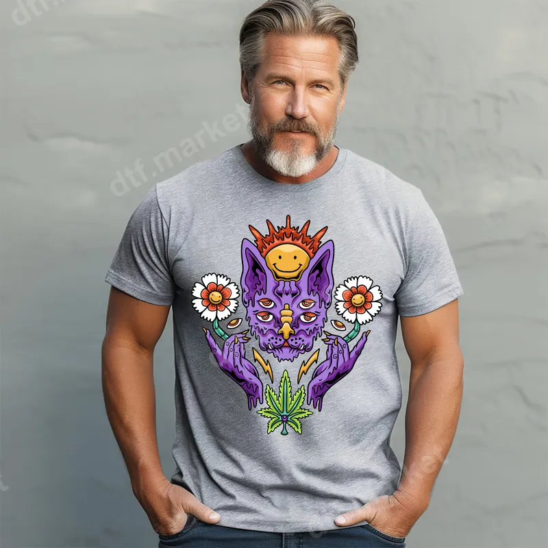See allThis vibrant DTF transfer showcases a multi-eyed psychedelic cat with a melting, drippy aesthetic, holding flowers topped with cheerful smiley faces. A grinning sun radiates positive vibes above its head, and a stylized cannabis leaf anchors the base. This unique design blends counter-culture artistry with whimsical surrealism, ensuring it's ready to press for easy application. Perfect for free spirits, cannabis enthusiasts, and anyone appreciating groovy, unique art, this design is ideal for personalizing your wardrobe. Heading to a music festival, a casual gathering, or simply expressing a laid-back style, this heat transfer makes a bold statement. It's also an excellent gift for friends who love trippy aesthetics, cats, or celebrating 4/20. Our direct to film transfer technology ensures stunning results on various materials like cotton, polyester, and blends. For best application, use a heat press at 300-325°F for 15 seconds with medium pressure, cool peel. A household iron can also be used. Unlike vinyl transfer options, this design requires no weeding, saving time. Crafted with professional-grade DTF film, this iron on transfer delivers incredibly vibrant colors and sharp details that truly pop. The durable ink is crack-resistant and soft to the touch, ensuring your custom apparel feels as good as it looks. Enjoy long-lasting wear and a premium finish that elevates any t-shirt transfer, hoodie, or accessory.
