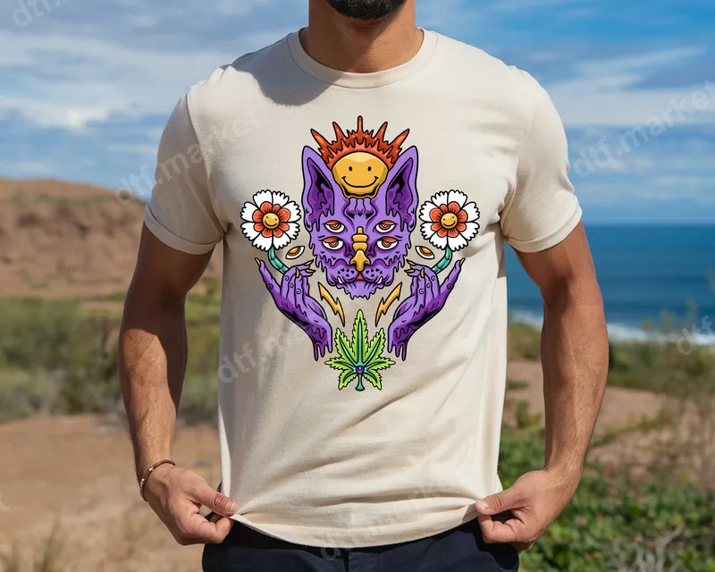 See allDive into a world of vibrant surrealism with this eye-catching psychedelic melting cat DTF transfer. Featuring a multi-eyed purple cat with dripping features, flanked by hands holding smiley-faced flowers, and crowned by a cheerful sun, this design also prominently showcases a cannabis leaf. This unique and ready to press DTF transfer captures a groovy, trippy aesthetic that stands out from the crowd. This one-of-a-kind design is perfect for free spirits, cannabis enthusiasts, festival-goers, streetwear aficionados, and anyone who loves unique, psychedelic art. It makes an excellent gift for birthdays, music festivals, or just to express a distinct personal style. Transform plain garments into wearable art that sparks conversation and spreads good vibes. Applying this heat press transfer is incredibly easy, suitable for a wide range of fabrics including cotton, polyester, and their blends. For best results, use a heat press at 300-325°F for 15 seconds with medium pressure, followed by a cold peel. Even a household iron can achieve great results, making this iron on decal accessible for everyone. Say goodbye to tedious weeding – simply press and enjoy! Our DTF transfers are crafted with professional-grade film, ensuring maximum vibrancy, exceptional detail, and outstanding durability. The prints are crack-resistant, soft to the touch, and designed to withstand countless washes without fading. Elevate your apparel with a high-quality, long-lasting custom transfer that feels as good as it looks.