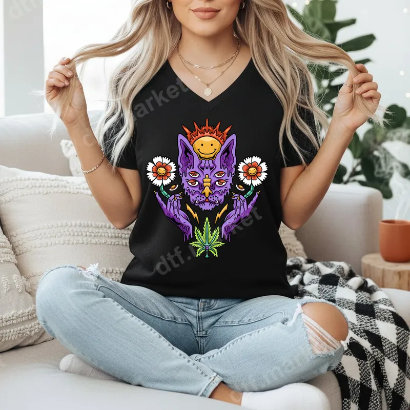 See allThis vibrant DTF transfer features a mesmerizing psychedelic melting cat design, rendered in striking purple hues with multi-eyes and a radiant smiley face sunburst. Flanked by delicate daisies and grounded by a bold cannabis leaf, this ready to press design embodies a trippy, free-spirited vibe perfect for making a statement. Ideal for those who embrace alternative styles, cannabis culture, or unique art. This eye-catching heat press transfer is perfect for music festivals, casual wear, or as a thoughtful gift for friends who appreciate bold, expressive apparel. Stand out in any crowd with this distinct graphic. Applying this apparel transfer is effortless. It works beautifully on a wide range of fabrics including cotton, polyester, and their blends. Simply use a heat press at 300-325°F for 15 seconds with medium pressure, or apply with a household iron. Best of all, there’s no weeding required, making custom garment creation quick and simple with this fantastic iron on decal. Experience superior quality with our durable heat press designs. Each DTF transfer is crafted to be crack-resistant, vibrant, and incredibly soft to the touch, ensuring your custom shirt design looks and feels professional. The strong adhesive on our premium DTF film guarantees a long-lasting, high-quality finish.