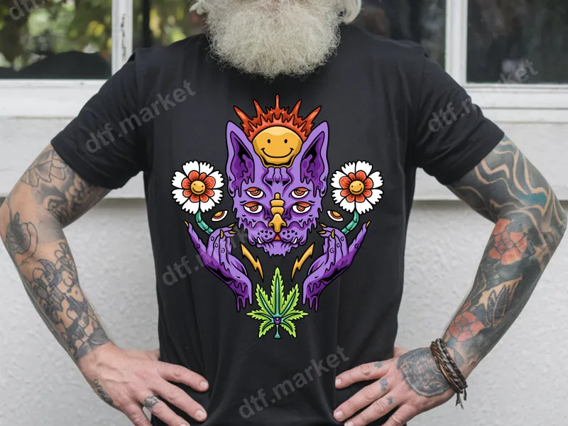 See allDive into a world of vibrant imagination with this eye-catching psychedelic trippy cat DTF transfer. This unique design features a mystical multi-eyed purple cat with a smiling sun crown, holding happy, blooming flowers, all grounded by a prominent cannabis leaf. It's a visually stunning and ready to press design that captures an eccentric, free-spirited vibe perfect for anyone looking to make a bold statement. This artistic direct to film transfer is ideal for festival-goers, cannabis enthusiasts, cat lovers with an edgy style, and anyone who appreciates psychedelic art. It makes an incredible gift for friends for birthdays, 420 celebrations, music festivals, or simply to add a touch of counter-culture cool to their everyday wardrobe. Express your individuality with this truly unique apparel transfer. Applying this high-quality heat press transfer is effortless, suitable for a wide range of fabrics including cotton, polyester, and blends. Simply use a heat press at 300-325°F for 15 seconds with medium pressure, then cold peel. For those without a heat press, a household iron can also achieve excellent results. No tedious weeding or intricate layering required – just press and go, making this a truly ready to press transfer. Crafted from professional-grade DTF film, this iron on transfer boasts incredibly vibrant colors that pop, superior crack resistance, and a soft-to-touch finish that feels great on any garment. The strong adhesive ensures a long-lasting, durable print that withstands washes and wear, making your custom creations look professionally made and stand out from the crowd.