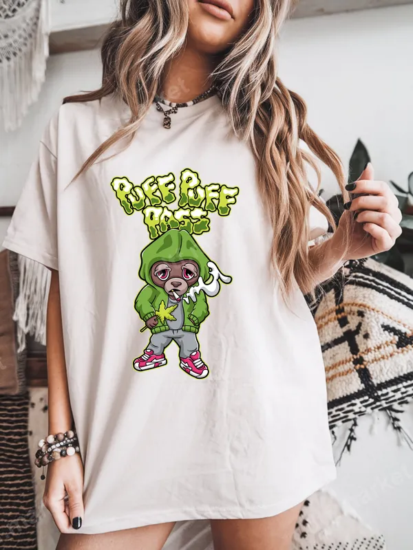See allThis vibrant DTF transfer features a cool, laid-back bear character sporting a green hoodie and pink sneakers, exhaling smoke from a lit joint. Above this chill bear, the iconic phrase "Puff Puff Pass" is rendered in a playful, bubbly green font, making for an eye-catching and humorous design. This ready to press transfer captures a specific lifestyle vibe, perfect for those who appreciate adult humor and a relaxed attitude. This unique heat press transfer is ideal for anyone looking to add some personality to their wardrobe, especially fans of cannabis culture, hip-hop, or streetwear fashion. It makes a fantastic gift for friends, partners, or even yourself, celebrating 4/20, birthdays, casual gatherings, or just everyday ironic wear. Perfect for individuals who enjoy a bit of edgy, funny graphic apparel. Applying this high-quality iron on transfer is incredibly simple. It's suitable for a wide range of materials, including cotton, polyester, and various fabric blends. Using a heat press, apply at 300-325°F for 15 seconds with medium pressure, then cold peel for optimal results. No tedious weeding is required, making your custom shirt design process quick and hassle-free. Experience professional-grade results with this durable apparel transfer. Our DTF prints boast vibrant colors that truly pop, exceptional crack resistance, and a soft, smooth feel on any garment. Each direct to film transfer is produced using premium film and strong adhesive, ensuring your design lasts wash after wash and maintains its striking appearance.