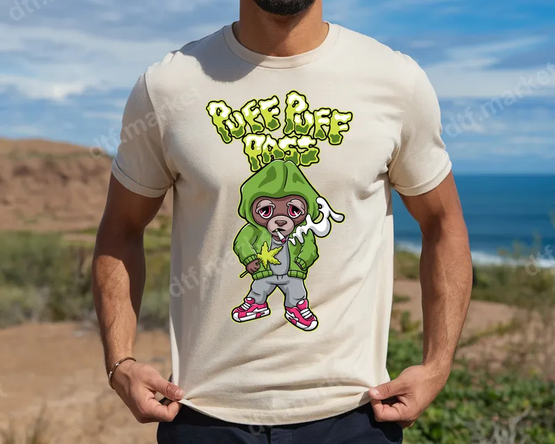 See allThis unique DTF transfer features a cool, cartoon-style monkey character sporting a green hoodie, exhaling smoke, and casually holding a cannabis leaf. The vibrant design is topped with the playful 'Puff Puff Pass' text in a matching gooey green font, making for an eye-catching and edgy statement piece. It’s a ready to press design perfect for adding a touch of laid-back, adult humor to any garment. This heat transfer is ideal for anyone with a love for streetwear, cannabis culture, or unique graphic tees. It makes a fantastic gift for friends who appreciate adult humor, for special 420 events, or simply to express a relaxed, free-spirited vibe. Perfect for personalizing apparel for casual outings, concerts, or just chilling at home, this design ensures you stand out. Applying this professional-grade iron on transfer is simple and efficient. It works seamlessly on a wide variety of fabrics, including cotton, polyester, and their blends, making it versatile for many projects. Use a heat press at 300-325°F for 15 seconds with medium pressure for optimal adhesion. For home users, a household iron can also be used following specific instructions. Best of all, there’s no weeding required, saving you time and effort. Our direct to film transfers are crafted using premium quality DTF film, ensuring vivid colors and sharp details that truly pop. The design is highly durable, crack-resistant, and offers a soft, smooth feel once applied to your garment. Experience professional-grade results with every t-shirt transfer, providing long-lasting wear and exceptional washability.