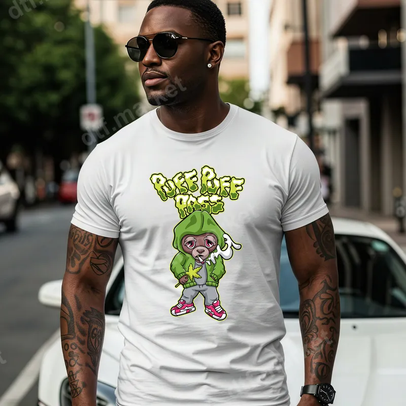 See allThis vibrant DTF transfer features a cool, stylized monkey character in a green hoodie, with bloodshot eyes, holding a lit joint and a cannabis leaf. Above the character, the phrase "PUFF PUFF PASS" is rendered in a playful, drippy green font, perfectly capturing a laid-back, stoner aesthetic. This ready to press design brings an urban, edgy vibe, making it a standout choice for anyone looking to add a touch of cannabis culture to their wardrobe. Designed for cannabis enthusiasts, streetwear lovers, and those with a bold sense of humor, this heat press transfer is ideal for casual wear, 420 celebrations, or as a unique gift for friends. It's perfect for concerts, festivals, or just lounging around, allowing you to express your chill personality. This transfer makes an unforgettable statement piece for anyone who appreciates unique, edgy apparel. Our high-quality DTF transfers are incredibly versatile and can be applied to a wide range of materials, including cotton, polyester, and various fabric blends. For best results, use a heat press at 300-325°F for 15 seconds with medium pressure. It can also be applied with a household iron for smaller projects. These iron on transfers require no weeding, saving you time and effort for a professional finish every time. Experience exceptional quality with our direct to film transfers. Each transfer boasts vibrant colors, superior detail, and a soft-to-touch feel that's crack-resistant and durable through countless washes. We use professional-grade DTF film with a strong adhesive, ensuring your custom transfer adheres seamlessly and lasts for a long time on your chosen garment or accessory, providing a professional look without the hassle.
