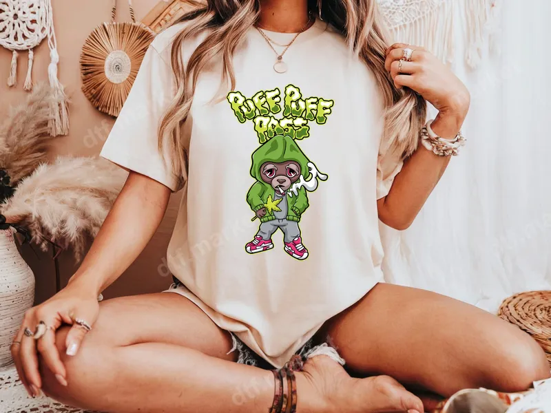 See allThis vibrant DTF transfer features a cool, cartoon monkey character sporting a green hoodie and pink sneakers, taking a 'puff puff pass.' The playful, edgy design is topped with bold, bubbly green text that reads 'PUFF PUFF PASS,' making it an instant conversation starter. It’s a completely ready to press transfer, perfect for adding unique flair to any garment with ease. Ideal for cannabis culture enthusiasts, those with a humorous side, or anyone looking to express their chill vibes. This funny heat transfer makes a fantastic gift for friends, a standout design for 4/20 celebrations, music festivals, or just casual everyday wear. It’s also a great way for small businesses to offer unique apparel that resonates with a specific niche market. Applying this design is a breeze, whether you're using a professional heat press or a household iron. For best results with a heat press, apply at 300-325°F for 15 seconds with medium pressure. DTF transfers are incredibly versatile and work beautifully on a wide range of fabrics, including cotton, polyester, and their blends. Unlike vinyl, there's absolutely no weeding required, saving you time and effort. Experience superior quality with our premium direct to film transfers. Each iron on transfer boasts vibrant colors that pop, is crack-resistant, and feels soft to the touch, ensuring comfort and durability. Our professional-grade DTF film provides strong adhesive properties for a lasting bond, making it the perfect t-shirt transfer solution for creating durable, eye-catching custom apparel.