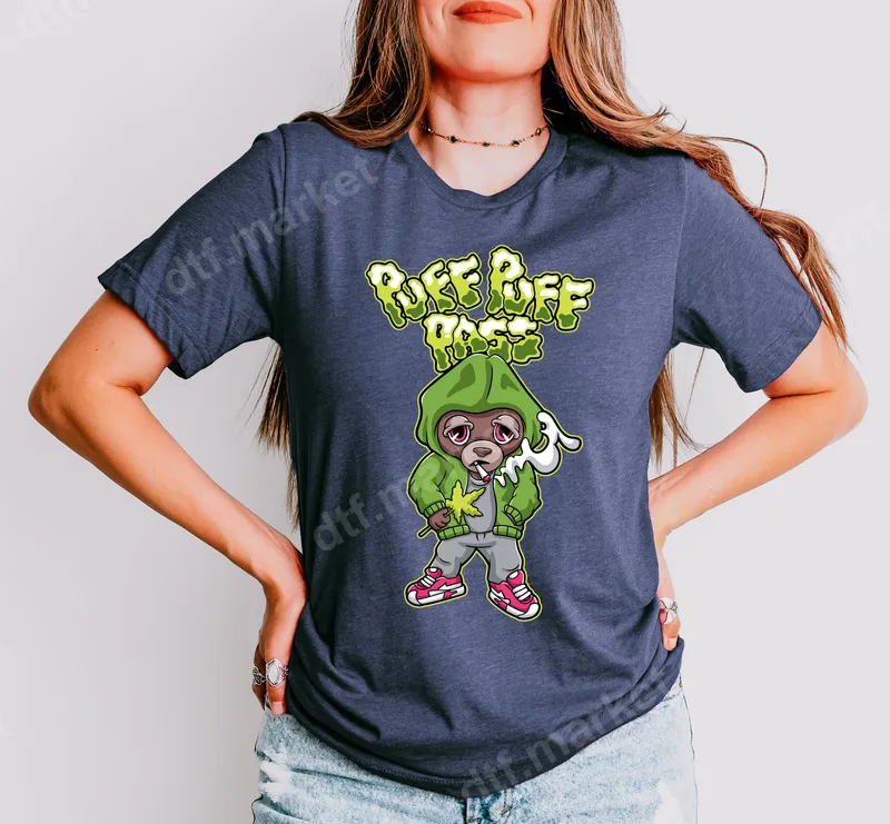 See allThis vibrant DTF transfer features a cool, laid-back monkey character in a green hoodie, holding a cannabis leaf and smoking. Above the character, the playful, smoky text "PUFF PUFF PASS" is displayed, making it an unmistakable statement piece. This ready to press transfer brings a chill, edgy vibe to any garment. Perfect for enthusiasts of cannabis culture, streetwear aficionados, and anyone who appreciates a touch of adult humor in their wardrobe. This apparel transfer is an ideal gift for friends, for 4/20 celebrations, or just to express a relaxed, carefree attitude. Showcase your personality at festivals, casual hangouts, or everyday wear. Applying this premium heat press design is simple and hassle-free. It works perfectly on a variety of fabrics including cotton, polyester, and blends. Use a heat press at 300-325°F for 15 seconds with medium pressure, or apply with a household iron for equally great results. No tedious weeding or layering required, making it a quick and easy iron on decal. Experience professional-grade quality with every application. Our DTF transfers are known for their vibrant colors, exceptional durability, and soft-to-the-touch feel, ensuring your design won't crack or peel. Each heat press ready transfer is printed on high-quality film with strong adhesive, providing a long-lasting and crisp finish that stands up to washes.