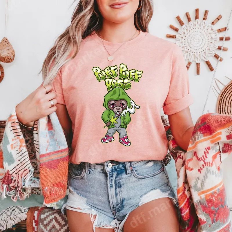 See allDive into the laid-back vibe with our "Puff Puff Pass" monkey DTF transfer. This vibrant design features a cool cartoon monkey in a green hoodie and pink sneakers, casually smoking and holding a cannabis leaf. The iconic phrase "PUFF PUFF PASS" appears in a bubbly, smoky green font above. It's an edgy statement piece, perfect for adding a unique touch to your wardrobe. This high-quality direct to film transfer is ready to press, making customization incredibly easy. This adult-themed design is perfect for 420 enthusiasts, streetwear lovers, and anyone with a playful, rebellious spirit. Ideal for casual wear, 420 events, music festivals, or simply as a bold statement. It makes a fantastic gift for friends who appreciate cannabis culture or enjoy funny, edgy graphic tees. Express your personality and stand out from the crowd with this distinctive heat press design. Our DTF transfers are incredibly versatile, applying smoothly to a wide range of fabrics including cotton, polyester, and various blends. Achieve professional results with a heat press set at 300-325°F for just 15 seconds with medium pressure, followed by a cold peel. For smaller projects, a household iron can also work effectively. No weeding or complex layering is required, making this heat press transfer a convenient choice for custom apparel. Experience superior quality with every transfer. Our direct to film transfers boast vibrant colors that pop, along with exceptional crack resistance and a soft, smooth feel once applied. Crafted using premium DTF film and strong adhesive, this t-shirt transfer ensures long-lasting durability, wash after wash. Elevate your custom shirt design game with a durable and eye-catching apparel transfer.