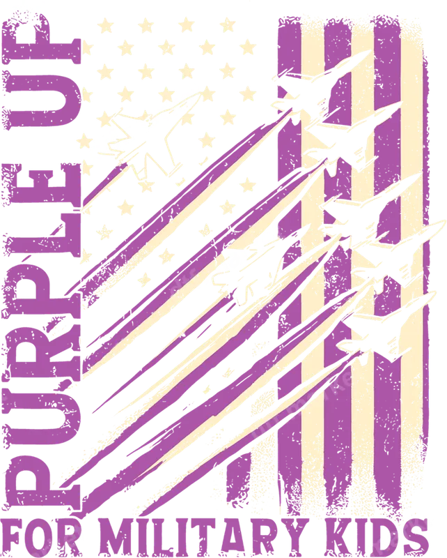 See allThis impactful DTF transfer proudly features the message "Purple Up For Military Kids" against a distressed American flag backdrop, complete with soaring fighter jets. The design utilizes a distinctive purple and cream color scheme, offering a unique twist on traditional patriotic imagery. As a ready to press transfer, it's perfect for quickly customizing apparel with a powerful statement. This design is ideal for military families, veterans, educators, and anyone who wants to show unwavering support for the children of service members. It’s perfect for Month of the Military Child events in April, military appreciation gatherings, or as a thoughtful gift for military spouses and parents. Create custom t-shirts for school events, community fundraisers, or simply to wear your pride daily. Our premium DTF transfers are incredibly versatile, adhering beautifully to a wide range of fabrics including 100% cotton, polyester, and various blends. Application is straightforward: simply use a heat press at 300-325°F for 15 seconds with medium pressure, then cold peel. No tedious weeding or layering required, making it a hassle-free iron on transfer solution for any project. Experience professional quality with vibrant, crack-resistant colors and a soft-hand feel that lasts wash after wash. Each heat press design is printed on durable, high-quality film with a strong adhesive, ensuring your custom t-shirt transfer looks fantastic and holds up over time. Elevate your apparel with a design that combines heartfelt sentiment with superior durability.