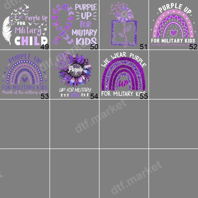 See allThis eye-catching DTF transfer proudly displays a vibrant glittery purple rainbow with the empowering message "We Wear Purple" arched above and "UP" boldly placed in the center, all accompanied by "For Military Kids." It's a striking and supportive ready to press design perfect for showing solidarity during Month of the Military Child or any time of year. This apparel transfer captures a spirit of community and unwavering support for military families. This meaningful iron on transfer is ideal for military parents, children, spouses, and friends who want to honor and support military kids. Wear it proudly during Month of the Military Child in April, at school events, community gatherings, or simply as an everyday statement of pride. It makes a thoughtful gift for anyone connected to the armed forces or those dedicated to raising awareness for military youth. Applying this ready to press transfer is incredibly simple, suitable for a wide range of fabrics including cotton, polyester, and various blends. For best results, use a heat press at 300-325°F for 15 seconds with medium pressure, followed by a cold peel. It can also be applied with a household iron with careful attention. Unlike vinyl transfers, there's absolutely no weeding required, making your customization process quick and hassle-free. Our direct to film transfers are crafted with premium materials to ensure exceptional quality and durability. Expect vivid colors, outstanding crack resistance, and a soft, flexible feel that seamlessly integrates with your garment. Each heat transfer design utilizes professional-grade DTF film and strong adhesive, guaranteeing a long-lasting, professional finish that stands up to countless washes and wears.