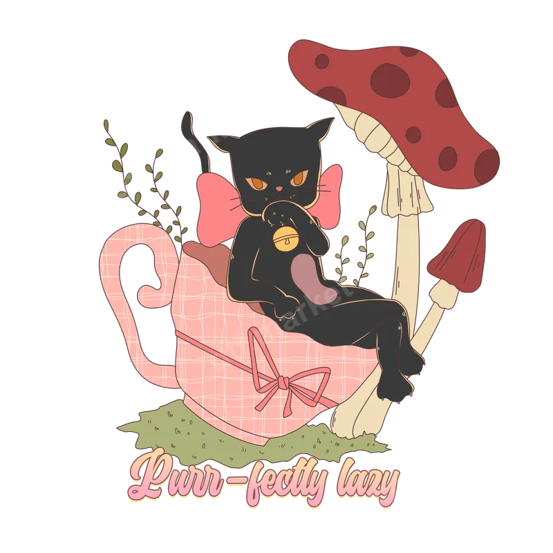 See allIndulge in ultimate relaxation with our 'Purr-fectly Lazy' black cat DTF transfer. This charming design features a whimsical black cat lounging comfortably in a pink plaid teacup, adorned with a delicate pink bow and bell, surrounded by whimsical mushrooms and greenery. It's a delightful blend of cute, cozy, and a touch of cottagecore aesthetic, making it a truly unique ready to press transfer for your next project. This adorable heat transfer is ideal for cat moms, pet lovers, and anyone who appreciates a touch of humor and cuteness in their wardrobe. Perfect for casual wear, gifting to a feline-loving friend, or celebrating a birthday, this design adds a laid-back, charming flair. It's also a fantastic iron on transfer for crafters looking to create custom apparel or accessories with ease. Applying this vibrant heat press design is incredibly simple. It works beautifully on a wide range of fabrics, including cotton, polyester, and their blends. For best results, use a heat press at 300-325°F for 15 seconds with medium pressure. No more tedious weeding like with traditional vinyl transfer – this direct to film transfer is ready to go straight from the film to your garment. You can even use a household iron for smaller projects. Experience professional-grade quality with our durable DTF transfers. Each design boasts vibrant colors that pop, superior stretch and crack resistance, and a soft-to-touch finish that feels like part of the fabric. Crafted using premium DTF film and strong adhesive, these apparel transfers ensure your custom creations last wash after wash, maintaining their charm and integrity.