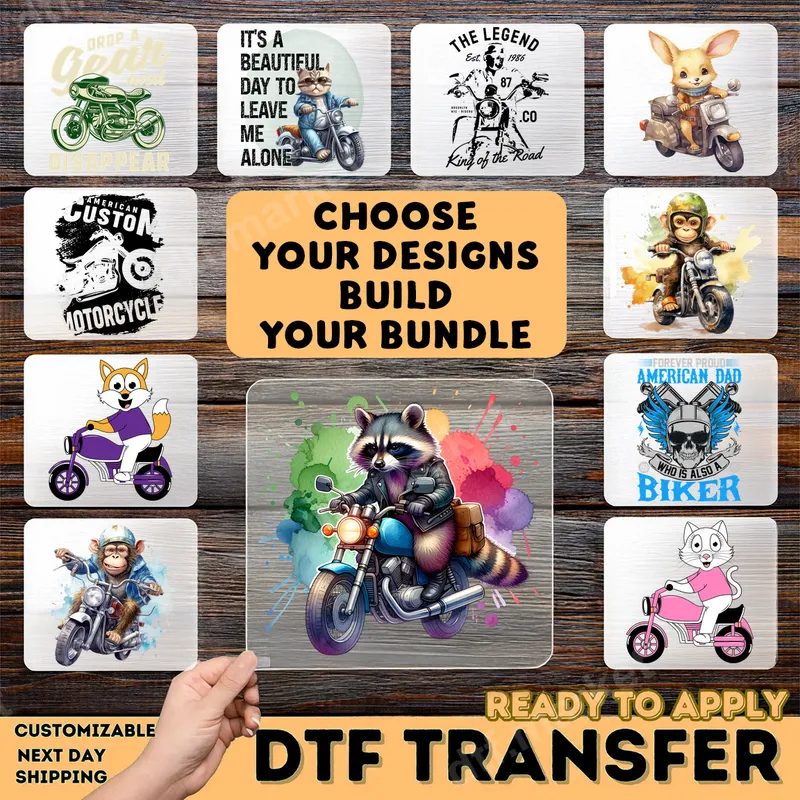See allThis captivating DTF transfer features a cool raccoon confidently riding a classic blue motorcycle, set against a vibrant splash of watercolor hues. The design perfectly blends edgy biker style with adorable animal charm, making it a standout piece for any wardrobe. This high-quality, ready to press DTF transfer ensures a professional finish on your chosen garment, bringing unique personality to your apparel. Ideal for motorcycle enthusiasts, animal lovers, or anyone who appreciates a touch of quirky style, this design is perfect for Father's Day gifts, birthday presents, or just upgrading your everyday casual wear. It's an excellent choice for motorcycle rallies, casual outings, or simply expressing your unique personality. This versatile heat press design appeals to a wide range of ages and tastes, from teen to adult. Applying this iron on transfer is incredibly simple. It works flawlessly on cotton, polyester, and most fabric blends. For best results, use a heat press at 300-325°F for 15 seconds with medium pressure, then peel cold. You can even use a household iron for smaller applications, following similar temperature guidelines. Best of all, there's no weeding or intricate prep work required, making your customization process quick and hassle-free. Crafted with professional-grade DTF film, this apparel transfer boasts incredibly vibrant colors that pop and a soft, smooth feel that integrates seamlessly with the fabric. The design is highly durable, crack-resistant, and built to withstand countless washes, ensuring your personalized item looks fantastic for years to come. Experience the professional quality and ease of a superior heat press transfer.