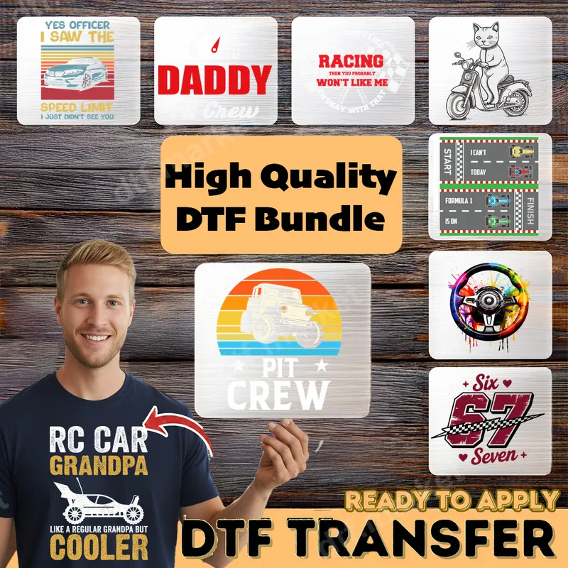 See allThis dynamic collection of designs captures the thrill and humor of racing and automotive culture. Featuring vintage-inspired cars, playful sayings like "Yes Officer I Saw The Speed Limit" and "Racing Then You Probably Won't Like Me," and family-focused graphics such as "Daddy Pit Crew" and "RC Car Grandpa," these images are perfect for enthusiasts of all ages. Each vibrant graphic is a high-quality DTF transfer, meticulously printed and ready to press onto your favorite apparel. These versatile heat press transfer designs are ideal for car show attendees, racing fans, mechanics, and anyone who loves custom automotive gear. They make fantastic gifts for Father's Day, birthdays, or just to celebrate the dad or grandpa in your life who enjoys cars, remote control racing, or even just a good car-themed joke. Perfect for customizing family reunion shirts, team apparel, or unique gifts for gearheads. Applying your new heat press design is simple and hassle-free. Our ready to press transfers work flawlessly on a wide variety of fabrics, including cotton, polyester, and their blends. For best results, use a heat press at 300-325°F for 15 seconds with medium pressure. These high-quality iron on transfers require absolutely no weeding, saving you time and effort so you can enjoy your custom creation faster. Experience professional-grade results with our premium t-shirt transfer. Each design boasts vibrant, true-to-life colors that resist cracking and fading, ensuring your garment looks great wash after wash. The soft-touch finish integrates seamlessly with fabric, providing a comfortable feel. Crafted using durable DTF film and strong adhesive, these apparel transfers are built to last, delivering long-term satisfaction for all your custom projects.