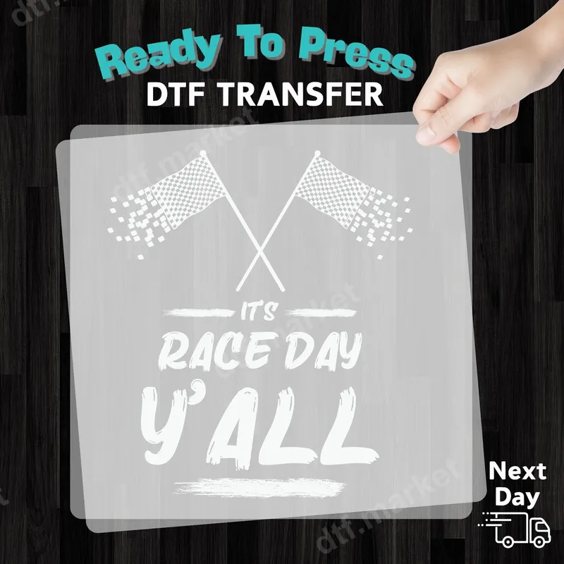 See allThis vibrant "It's Race Day Y'all" DTF transfer features classic checkered racing flags crossed above the spirited phrase in a bold, distressed font. One flag artfully dissolves into pixels, adding a modern, dynamic edge to this design. It’s the perfect ready to press graphic for anyone eagerly anticipating race day, combining classic racing iconography with a touch of Southern charm. Ideal for racing enthusiasts, NASCAR fans, drag race spectators, or anyone who loves the thrill of motorsports, this heat press transfer is fantastic for personalizing apparel. Create custom t-shirts for race events, family gatherings at the track, tailgating parties, or as a fun gift for the speed demon in your life. It's also great for small businesses making unique apparel for local race circuits or fan clubs. Our premium DTF transfers are incredibly versatile and can be applied effortlessly to a wide range of materials, including 100% cotton, polyester, and various blends. Achieve a professional finish using a heat press set at 300-325°F for 15 seconds with medium pressure. For home crafters, this iron on transfer can also be applied with a household iron (though a heat press is recommended for best results). No complicated weeding is required, saving you time and effort. Experience superior quality with our durable heat press design. Each apparel transfer boasts vibrant colors that pop, is highly crack-resistant, and features a soft, flexible feel that seamlessly integrates with your garment. Made with professional-grade DTF film and a strong adhesive, your custom transfer will withstand countless washes, ensuring your race day spirit lasts all season long.