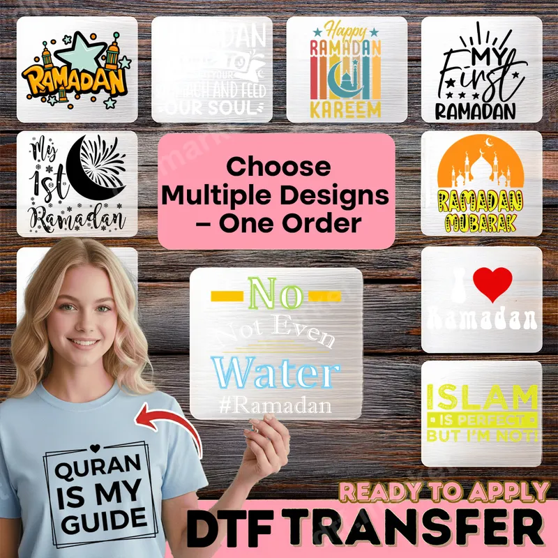 See allDiscover our inspiring collection of Ramadan and Islamic themed DTF transfers, perfect for celebrating the holy month. This versatile range includes designs from festive 'Happy Ramadan Mubarak' graphics with crescent moons and mosques, to humorous 'No Not Even Water' text, and heartfelt messages like 'Quran is My Guide.' Each direct to film transfer is ready to press, offering a vibrant and detailed design that will elevate any garment or accessory. These unique iron on transfers are ideal for anyone observing Ramadan, celebrating Eid al-Fitr or Eid al-Adha, or simply wanting to express their Islamic faith year-round. They make thoughtful gifts for family and friends, perfect for creating custom apparel for community events, mosque gatherings, or everyday wear. From joyful 'My First Ramadan' designs for children to profound statements, there's a design for every age and style. Applying these ready to press transfers is straightforward, ensuring a professional finish. Simply use a heat press at 300-325°F for 15 seconds with medium pressure, or apply with a household iron. Our heat press transfers work beautifully on a wide range of fabrics including cotton, polyester, and blends, providing a permanent and durable bond without any tedious weeding required. Just press and peel! Each DTF transfer is crafted using high-quality film and inks, resulting in designs that are exceptionally vibrant, crack-resistant, and soft to the touch. These professional-grade t-shirt transfers maintain their color and integrity wash after wash, making them a fantastic choice for creating long-lasting, personalized garments or unique decor items. Express your faith with confidence and style using our premium heat press designs.