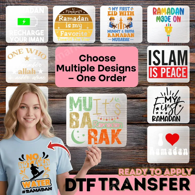 See allThese vibrant Ramadan and Eid Mubarak DTF transfers feature a beautiful array of designs perfect for celebrating the holy month. From inspirational quotes like "Ramadan Recharge Your Iman" and "Islam Is Peace" to heartwarming messages like "My First Eid With Mummy & Pappa Ramadan Mubarak," each unique graphic brings a special touch to your apparel. These direct to film transfers are ready to press, making it easy to create custom garments that reflect your faith and joy during this sacred time. Ideal for Muslims celebrating Ramadan, Eid al-Fitr, or Eid al-Adha, these heat press transfers are perfect for personalizing family outfits, community events, or thoughtful gifts. They cater to individuals, parents looking for matching "My First Ramadan" or "My First Eid" designs for their children, and anyone wanting to express their Islamic faith with unique shirt designs. Create memorable moments and spread messages of peace and devotion throughout the holidays. Our premium DTF heat transfers are incredibly versatile, adhering flawlessly to a wide range of fabrics including cotton, polyester, and various blends. Applying your design is simple: use a heat press at 300-325°F for 15 seconds with medium pressure, or easily apply with a household iron. These iron on decals require no weeding, cutting, or complicated layering, ensuring a smooth and quick application process every time. Crafted using professional-grade DTF film, these apparel transfers boast exceptional quality. Enjoy vibrant colors that pop, superior durability that resists cracking or fading, and a soft, flexible feel that integrates seamlessly with your fabric. The strong adhesive ensures your design stays put wash after wash, providing a long-lasting, high-quality finish for all your custom apparel projects.