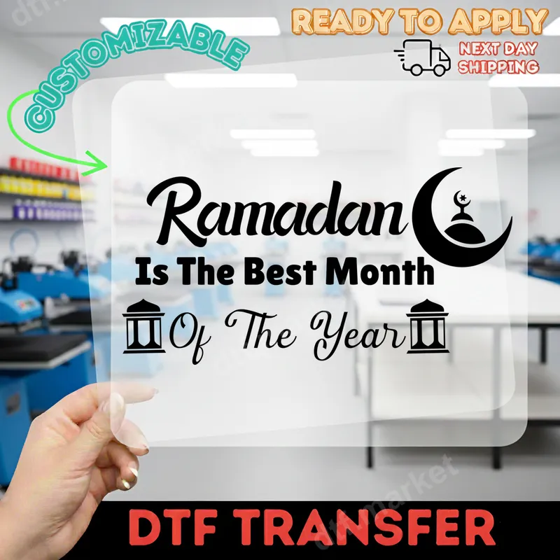 See allThis heartfelt DTF transfer proudly declares 'Ramadan Is The Best Month Of The Year' in a stylish blend of script and bold typography. The design is beautifully accented with a crescent moon and mosque silhouette, along with elegant architectural icons flanking the phrase. It embodies the spiritual joy and reverence for the holy month, making it a perfect ready to press design for personal expression or gifting. This powerful heat transfer is ideal for anyone wishing to express their devotion and celebrate the significance of Ramadan. It's perfect for community gatherings, family celebrations, Eid gifts, or everyday wear during the blessed month. Create custom apparel for yourself, friends, or family members to mark this special time of reflection and joy. This iron on decal is a thoughtful way to share your faith. Our premium DTF transfers are incredibly versatile, working flawlessly on a wide range of fabrics including cotton, polyester, and various blends. For professional results, apply with a heat press at 300-325°F for 15 seconds with medium pressure. It's also suitable for application with a household iron, making customization accessible to everyone. Enjoy the convenience of a ready to press transfer with no tedious weeding required. Experience exceptional quality with our direct to film transfers. Each design boasts vibrant colors, superior detail, and outstanding durability, ensuring your apparel transfer will be crack-resistant and soft to the touch. Printed on professional-grade DTF film with a strong adhesive, these heat press designs are engineered to withstand countless washes, keeping your message clear and your garment looking great for years to come.