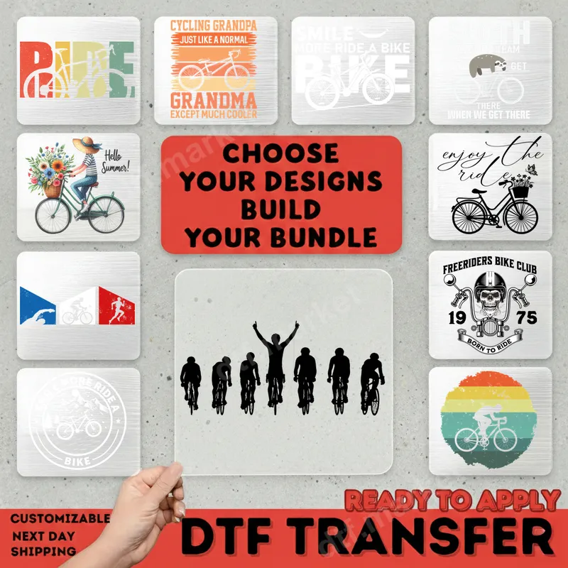 See allExplore our versatile collection of cycling DTF transfers, celebrating every aspect of bike life. This bundle features a wide range of styles, from vintage graphics to humorous quotes and elegant "Enjoy The Ride" motifs. Each high-quality direct to film transfer is ready to press, bringing your passion for biking to life on any garment with vibrant colors and sharp details. These ready to press bike designs are perfect for cycling enthusiasts, bike club members, and anyone who loves the open road. Create unique gifts for birthdays, Father's Day, or Mother's Day, or outfit your family with fun "Grandma" and "Grandpa" cycling designs. Ideal for group rides, charity events, fitness challenges, or simply showcasing your love for two-wheeled adventures, these heat press designs make personalizing apparel easy. Applying your new cycling heat transfer is a breeze, whether with a professional heat press or a household iron. Our versatile iron on decals adhere beautifully to cotton, polyester, and their blends. For best results, use a heat press at 300-325°F for 15 seconds with medium pressure, then cool peel. Unlike vinyl transfers, there’s no weeding required, making customization quick and effortless. Experience professional-grade results with our durable, soft-to-the-touch apparel transfers. Crafted using premium DTF film and strong adhesive, these direct to film transfers ensure designs are crack-resistant, vibrant, and long-lasting through countless washes. Our t-shirt transfers provide exceptional stretch and a smooth finish, ensuring your custom cycling gear looks and feels fantastic.
