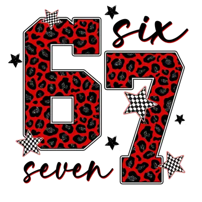 See allThis striking DTF transfer features the bold numbers "67" in a classic varsity style, prominently filled with a vibrant red leopard print and subtle glitter accents. The numbers are flanked by the elegant script words "six" above and "seven" below, adding a touch of sophistication. Scattered black and white checkered stars with red outlines complete the dynamic design, making it a perfect ready to press statement piece that combines fierce animal print with retro flair and a hint of racing-inspired cool. This eye-catching design is ideal for anyone celebrating a 67th birthday, anniversary, or simply looking to showcase a significant number with a unique, fashion-forward twist. It's a fantastic iron on transfer for crafters, small business owners, and individuals who love creating custom apparel that stands out. Perfect for personal wear, gifts, or adding to your boutique's inventory, this heat transfer design brings a bold and sassy attitude to any garment. Applying this high-quality heat press transfer is incredibly easy. It adheres perfectly to a wide range of materials including cotton, polyester, cotton-poly blends, and even nylon. Achieve professional results with a heat press (recommended settings: 300-325°F for 15 seconds, medium pressure) or a household iron. There’s no tedious weeding required—simply peel and press! Use it to personalize custom t-shirts, cozy hoodies, stylish sweatshirts, versatile tote bags, comfy pillow covers, or trendy denim jackets. For long-lasting vibrancy, wash your finished garment inside out and tumble dry on low heat. Our ready to press transfer offers exceptional quality with vibrant, full-color printing and crisp, fine details that truly pop. Enjoy a crack-resistant finish that feels soft to the touch, without the heavy, stiff feel often associated with vinyl transfers. Each direct to film transfer is meticulously printed on premium DTF film, ensuring a strong adhesive backing for professional-grade results on all your apparel projects.