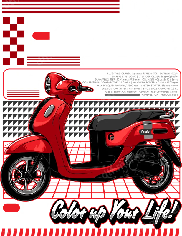 See allThis eye-catching DTF transfer showcases a sleek, vibrant red Yamaha Fazzio scooter, rendered in a dynamic vector art style. The design features precise details, including the "Fazzio HYBRID CONNECTED TECHNOLOGY" branding and 125cc engine specs, set against a modern black and red background with a cool retro grid pattern. Below the scooter, the hand-lettered phrase "Color up Your Life!" adds an energetic touch. This ready to press design is perfect for adding a burst of urban flair to any garment. Ideal for scooter enthusiasts, urban riders, and anyone who appreciates a unique streetwear aesthetic, this heat transfer makes a fantastic gift for motorcycle lovers or a stylish addition to your own custom apparel collection. It's perfect for casual everyday wear, showing off your passion at motorcycle rallies, or personalizing items for friends and family. This versatile iron on decal celebrates the moto lifestyle with a fresh, contemporary vibe. Applying this professional-grade t-shirt transfer is simple and efficient. It works beautifully on a wide range of fabrics, including cotton, polyester, and various blends. For best results, use a heat press at 300-325°F for 15 seconds with medium pressure, then peel cold. A household iron can also be used with firm, even pressure. Unlike vinyl transfers, there's no weeding required, making customization quick and easy. Crafted with premium DTF film and strong adhesive, this apparel transfer delivers exceptional quality. The colors are incredibly vibrant, resistant to cracking and fading, ensuring your design looks fresh wash after wash. The finished heat press design is soft to the touch, seamlessly integrating with the fabric for a comfortable feel. Enjoy a durable, high-quality graphic that stands out.