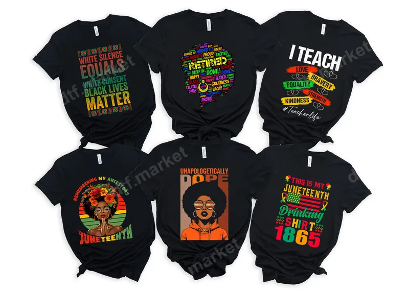 See allThe design features a beautiful Black woman adorned with a crown of vibrant flowers, set against a retro-inspired sunset background in red, yellow, and green. Below, the powerful message "Remembering My Ancestors Juneteenth" is displayed in matching colors. This unique DTF transfer beautifully captures the essence of heritage, strength, and celebration. It's a ready to press transfer, making it incredibly easy for you to create meaningful apparel. This impactful design is perfect for anyone celebrating Juneteenth, honoring Black history, or expressing cultural pride. It's ideal for Juneteenth parades, family gatherings, educational events, or as a thoughtful gift for activists, historians, and proud members of the Black community. Show your respect and remembrance with this powerful shirt design. Our direct to film transfers are incredibly versatile, pressing beautifully onto a wide range of materials including cotton, polyester, and various fabric blends. For best results, use a heat press at 300-325°F for 15 seconds with medium pressure. A household iron can also be used with careful application. Enjoy the convenience of an iron on transfer with no weeding or masking required, saving you time and effort. Experience premium quality with every heat press design. Our DTF transfers boast vibrant colors that pop, are highly crack-resistant, and offer a soft, smooth feel on your garments. Each apparel transfer is made with professional-grade DTF film and strong adhesive, ensuring a durable and long-lasting finish that withstands washes and wear.