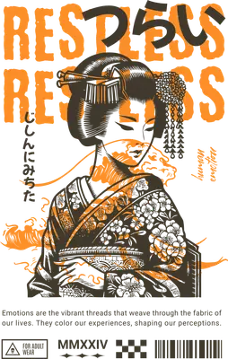 Unveil a piece of expressive art with this striking Restless Geisha DTF transfer. The design showcases a beautifully rendered Japanese woman in traditional attire, adorned with intricate floral patterns, reminiscent of classic ukiyo-e woodblock prints. Bold, distressed orange typography spells out "RESTLESS," subtly blending with Japanese characters and the phrase "human emotion," creating a compelling narrative of introspection and modern sentiment. This high-quality DTF transfer is vibrant and ready to press, perfect for making a statement. This artistic iron on transfer is ideal for individuals who appreciate Japanese culture, fine art, and modern streetwear aesthetics. It’s a perfect choice for graphic tee collectors, small apparel businesses seeking unique inventory, or anyone looking to express their inner world through fashion. Offer this distinctive heat transfer design as a thoughtful gift for artists, cultural enthusiasts, or fashion-forward friends on any occasion, from birthdays to personal milestones. Elevate your wardrobe with a design that speaks volumes. Applying this heat press transfer is simple and efficient. It adheres flawlessly to a wide range of materials including cotton, polyester, cotton-poly blends, and even nylon, ensuring versatility for your projects. Achieve professional results using a heat press at 300-325°F for 15 seconds with medium pressure, or apply with a household iron. Best of all, there's no weeding required—just peel and press! Create custom t-shirts, hoodies, sweatshirts, tote bags, denim jackets, or pillow covers. For lasting durability, wash garments inside out and tumble dry low. Experience premium quality with every ready to press transfer. This design boasts vibrant, full-color printing with exceptional fine detail, bringing the intricate artwork to life. Our DTF transfers are crack-resistant, soft to the touch, and avoid the heavy, stiff feel often associated with vinyl transfers. Each direct to film transfer is printed on high-grade DTF film with a strong, consistent adhesive backing, guaranteeing professional-grade results and a lasting finish that stands out.